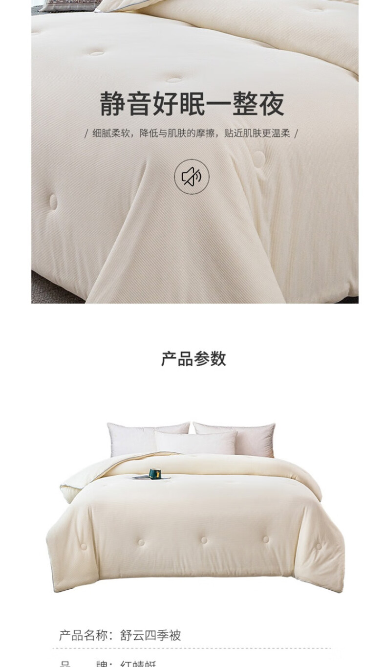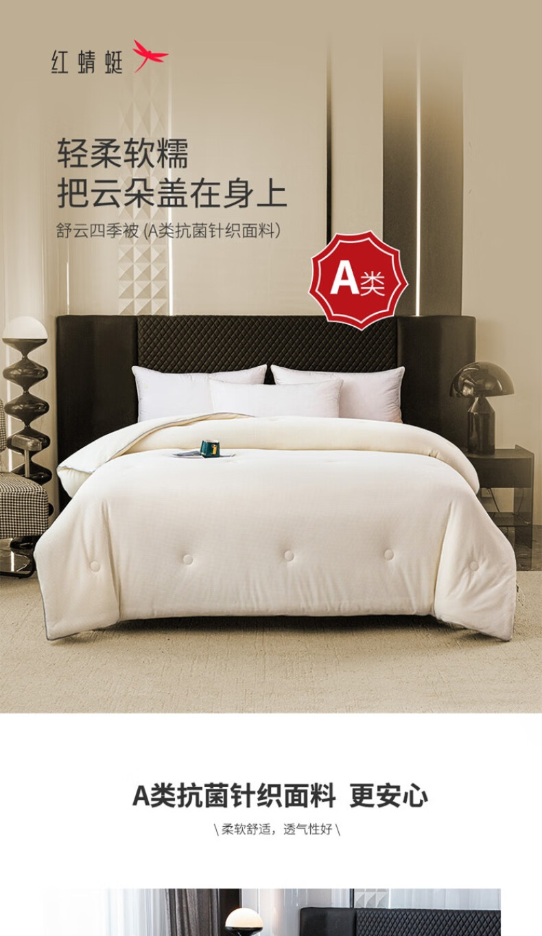商品属性 [供应商] 得力集团有限公司 [品牌] 红蜻蜓 [型号] HQT-XW6301 [商品标题] 红蜻蜓舒云四季被HQT-XW6301 200×230cm 2500g (单位:床) [销售单位] 床