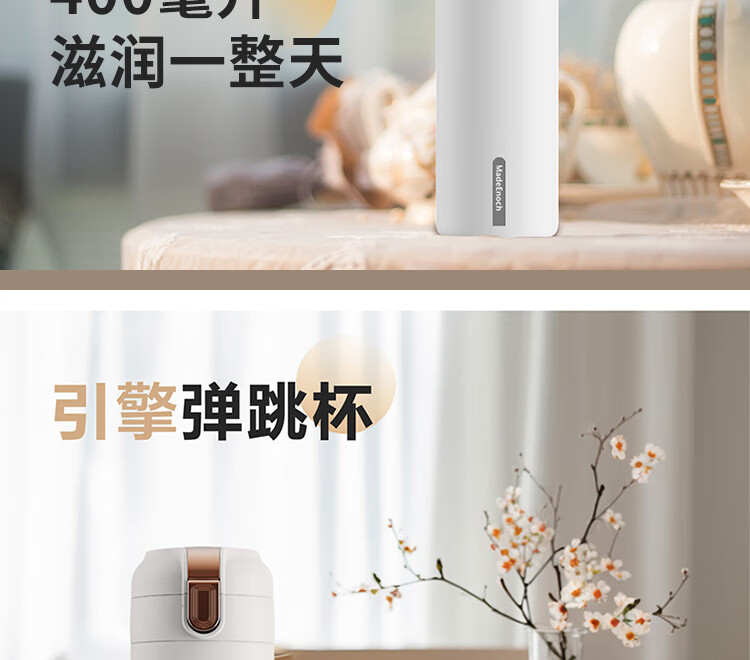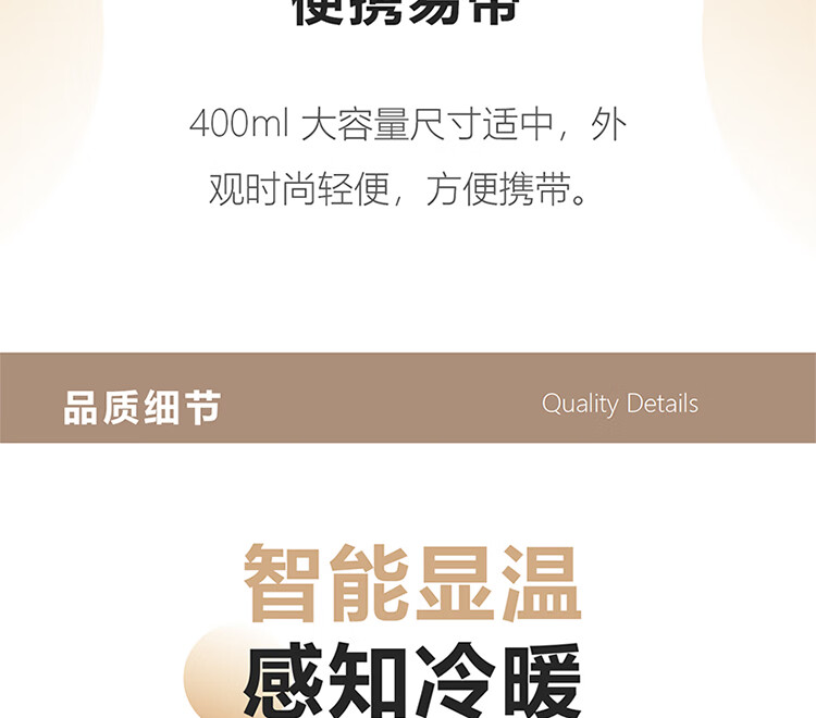 商品属性 [供应商] 德致商成集团有限公司 [适用场景] 户外旅行,通用 [内胆材质] 304不锈钢 [杯身主体材质] 304不锈钢 [适用人群] 通用 [国产/进口] 国产 [杯盖样式] 弹跳杯 [功能] 直饮、保温、触屏显温 [包装清单] 保温杯*1 [杯身材质] 304不锈钢 [容量] 400ml [杯身样式] 直升杯