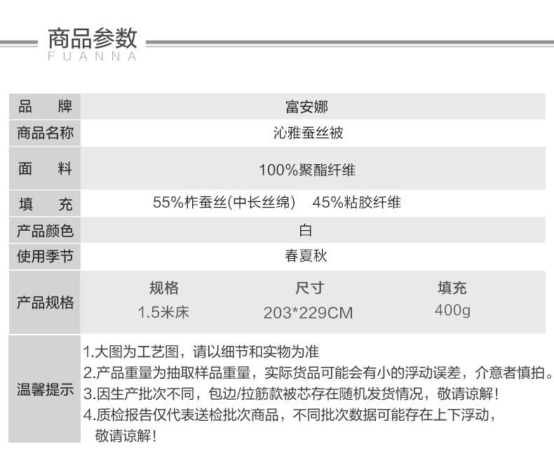 商品属性 [供应商] 深圳市怡亚通供应链股份有限公司 [品牌:] 富安娜(fuanna) [型号:] 沁雅 [规格:] 适用1.5米床 203*229cm 400g