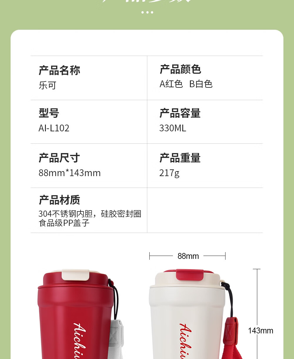 商品属性 [供应商] 德致商成集团有限公司 [杯盖样式] 旋盖 [适用场景] 职场,通用 [适用人群] 男士,女士 [国产/进口] 国产 [容量] 330ml [杯身样式] 直身杯