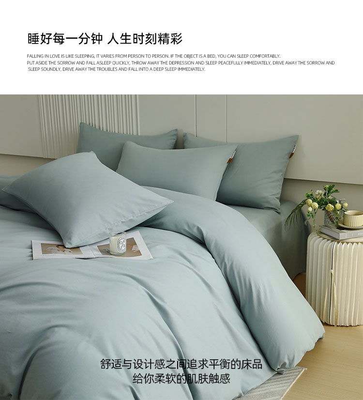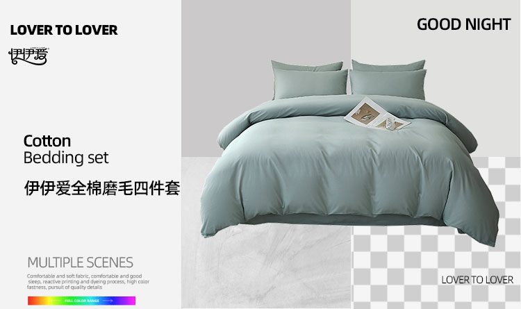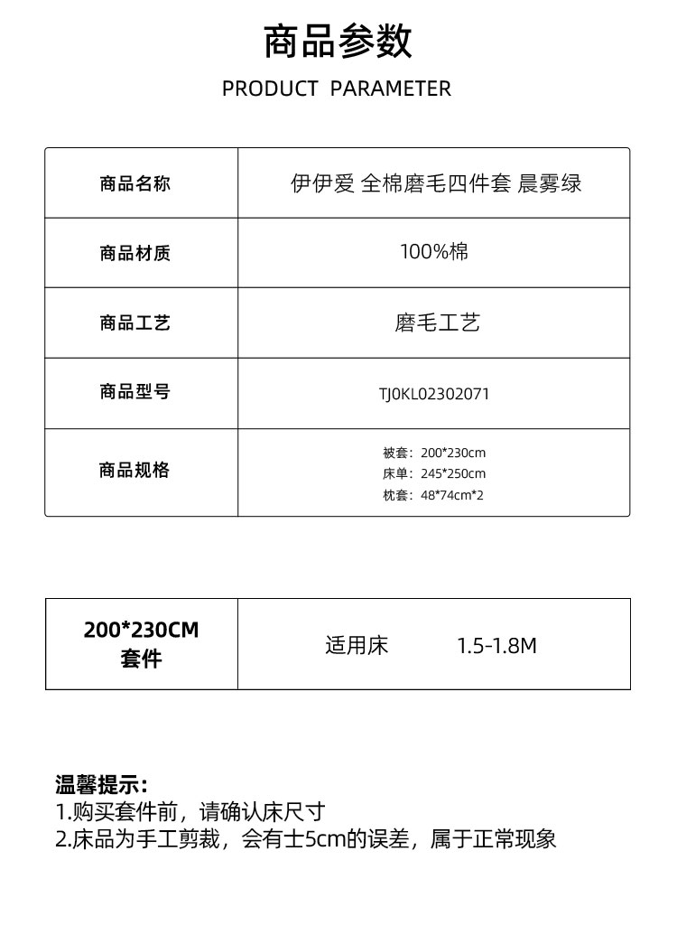 商品属性 [供应商] 得力集团有限公司 [品牌] 伊伊爱 [型号] TJ0KL02302071 [被套] 200*230cm [床单] 245*250cm [枕套] 48*74cm*2 [适用床] 1.5-1.8M [面料] 100%棉 [工艺] 磨毛工艺