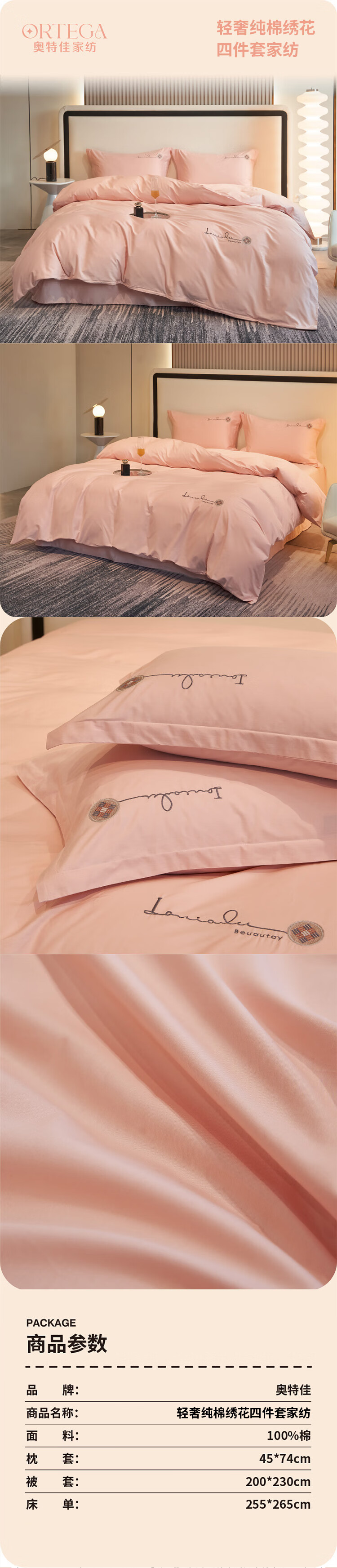 商品属性 [供应商] 全程速达科技有限公司 [名称] 内容 [品牌:] 奥特佳(ORTEGA) [商品名称:] 轻奢纯棉绣花四件套 [型号:] 001-010181