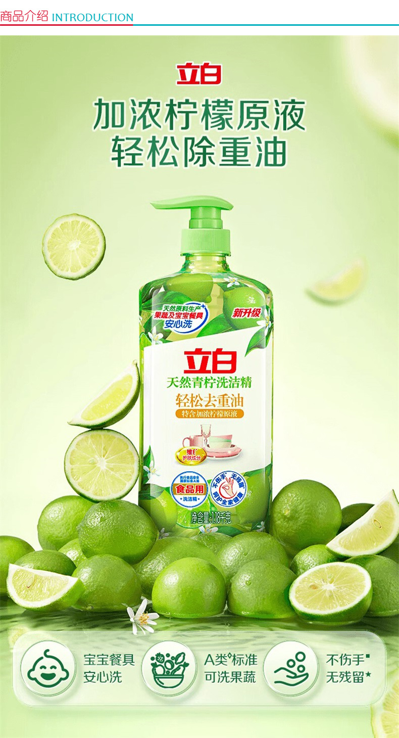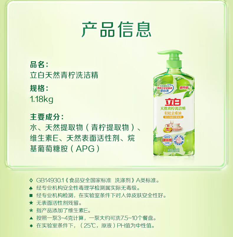 商品属性 [供应商] 科力普科技集团股份有限公司 [功效] 去油污 [产地] 大陆 [香型] 青柠 [保质期] 三年 [品牌] 立白 [型号] 天然青柠