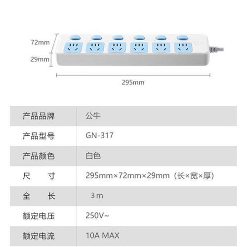商品属性 [供应商] 得力集团有限公司 [品牌] 公牛(BULL) [型号] GN-317 [商品标题] 公牛GN-317分控6位插排3米40个/箱(单位:个) [销售单位] 个