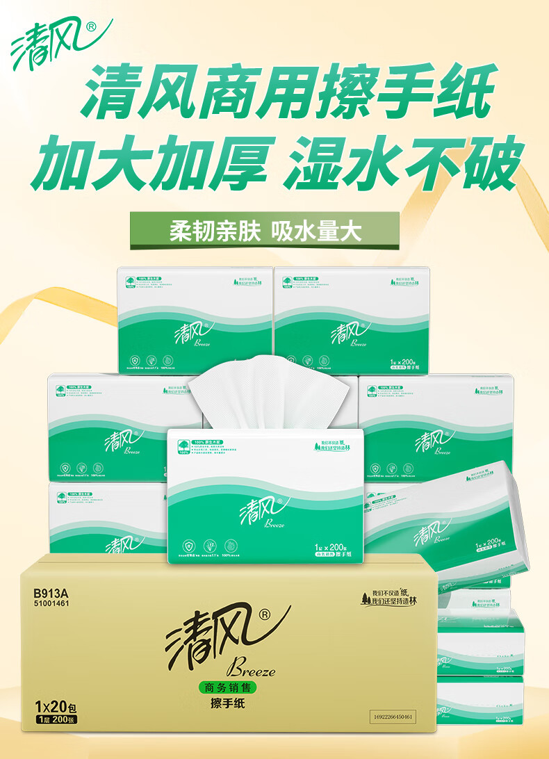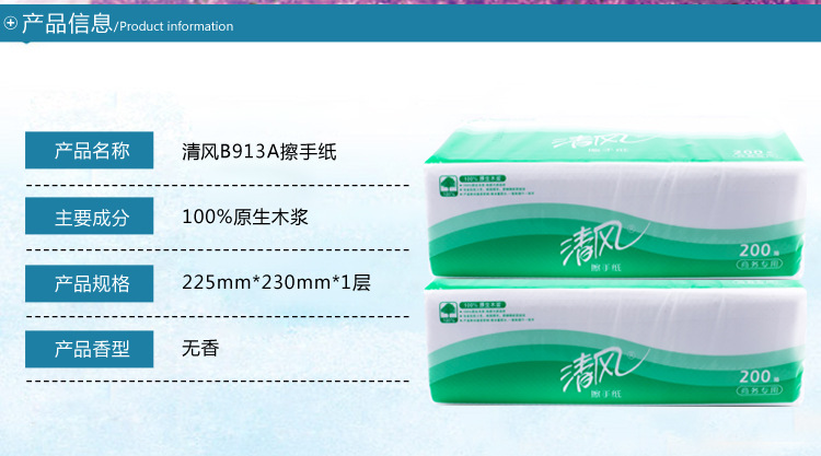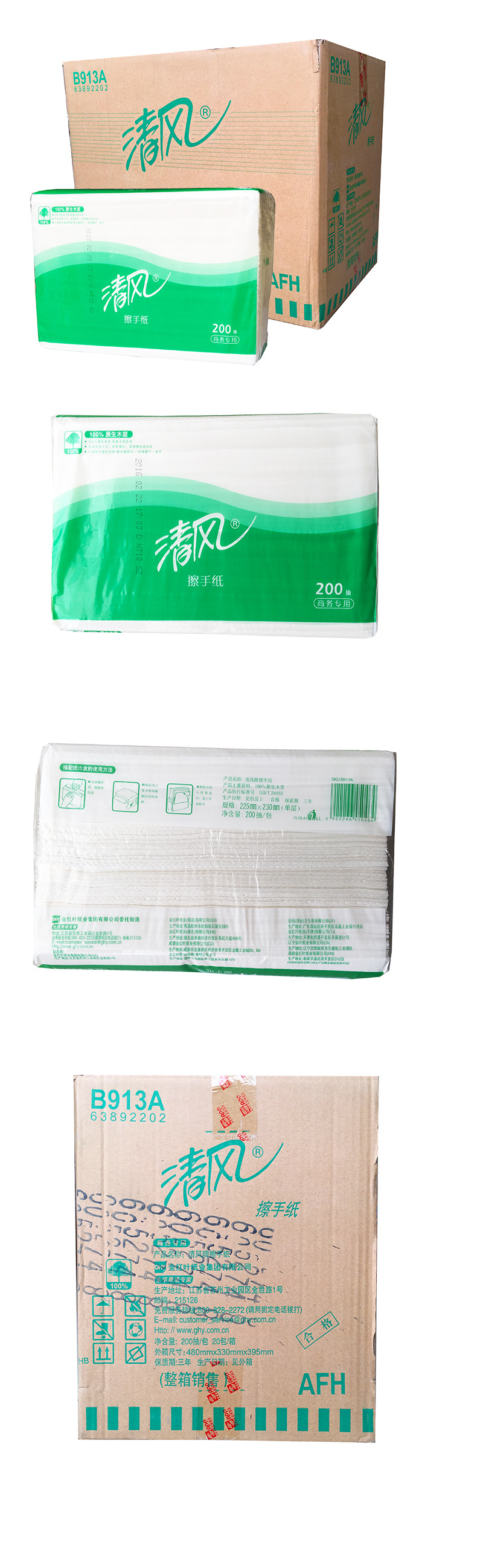 商品属性 [供应商] 得力集团有限公司 [品牌] 清风(APP) [型号] B913A [商品标题] 清风GT商务B913A擦手纸1层200张/包*1*20(单位:箱) [销售单位] 箱