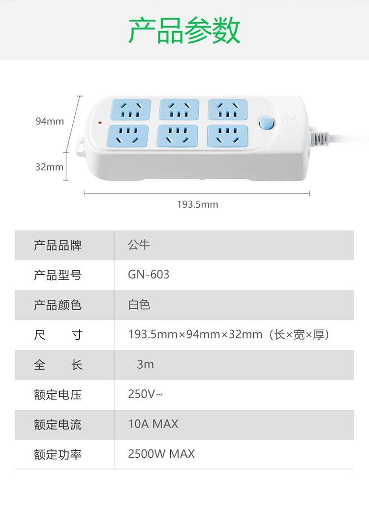 商品属性 [供应商] 得力集团有限公司 [品牌] 公牛(BULL) [型号] GN-603 [商品标题] 公牛GN-603总控6位插排3米30个/箱(单位:个) [销售单位] 个