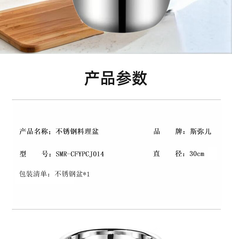 商品属性 [供应商] 得力集团有限公司 [品牌] 斯弥儿 [型号] SMR-CFYPCJ014 [商品标题] 斯弥儿 SMR-CFYPCJ014 不锈钢盆 30cm(单位:个) [销售单位] 个
