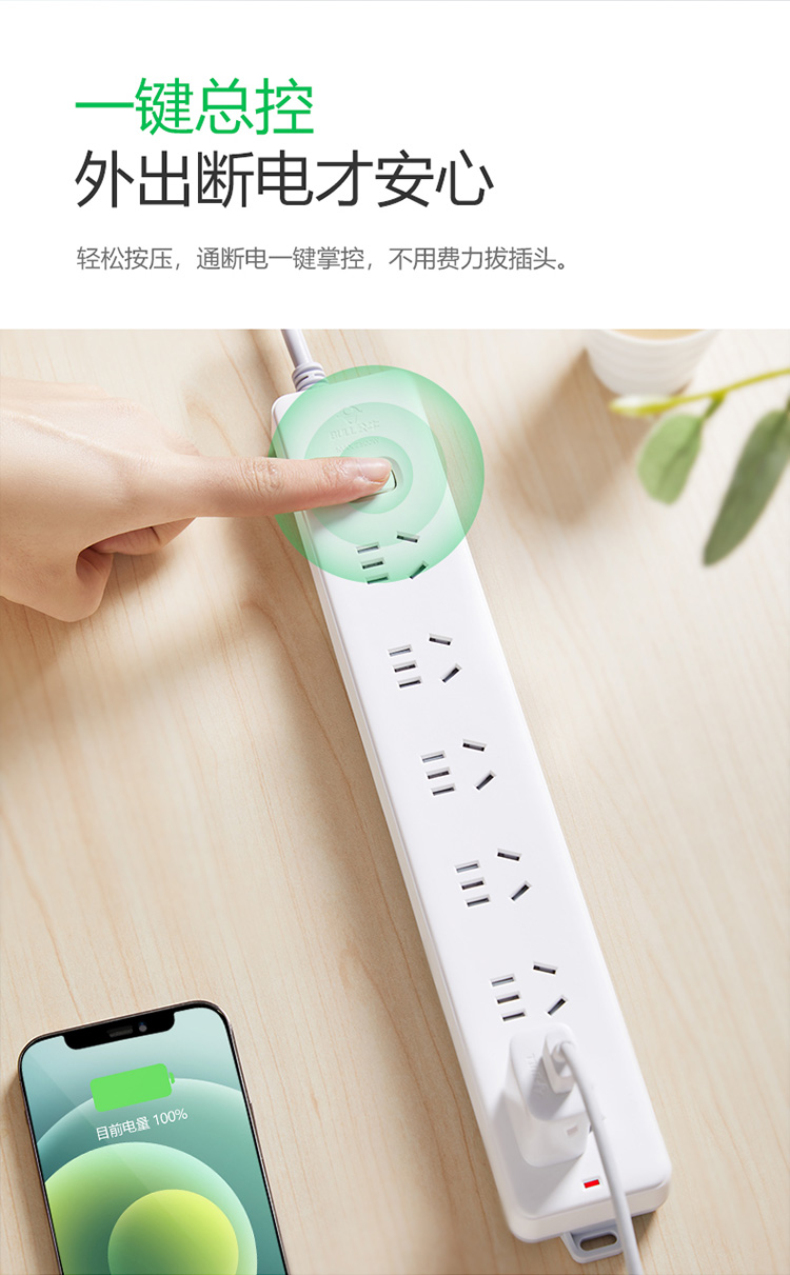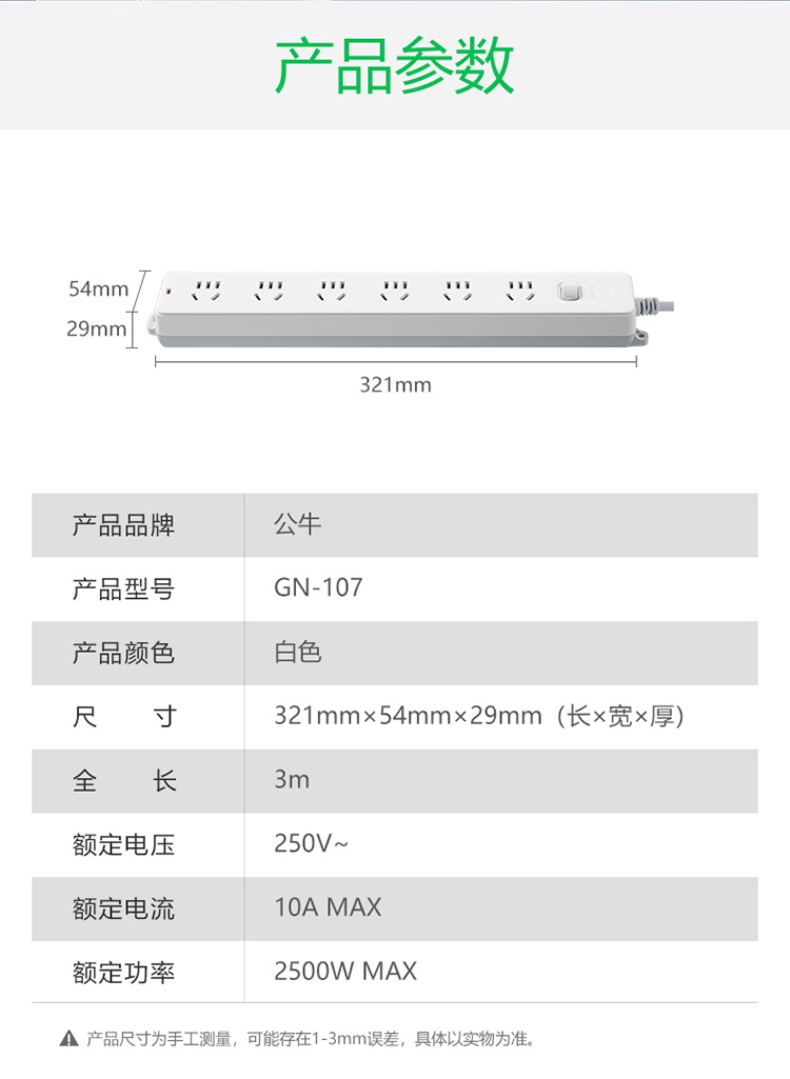 商品属性 [供应商] 科力普科技集团股份有限公司 [额定功率] 2500W [额定电流] 10A [有无独立开关] 有 [类型] 拖线板插座 [额定电压] 250V [线长] 3米 [插孔数] 6孔 [品牌] 公牛 [型号] GN-107
