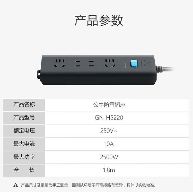 商品属性 [供应商] 得力集团有限公司 [品牌] 公牛(BULL) [型号] GN-H5220 [商品标题] 公牛GN-H5220总控4位防雷插座黑色1.8米(单位:个) [销售单位] 个
