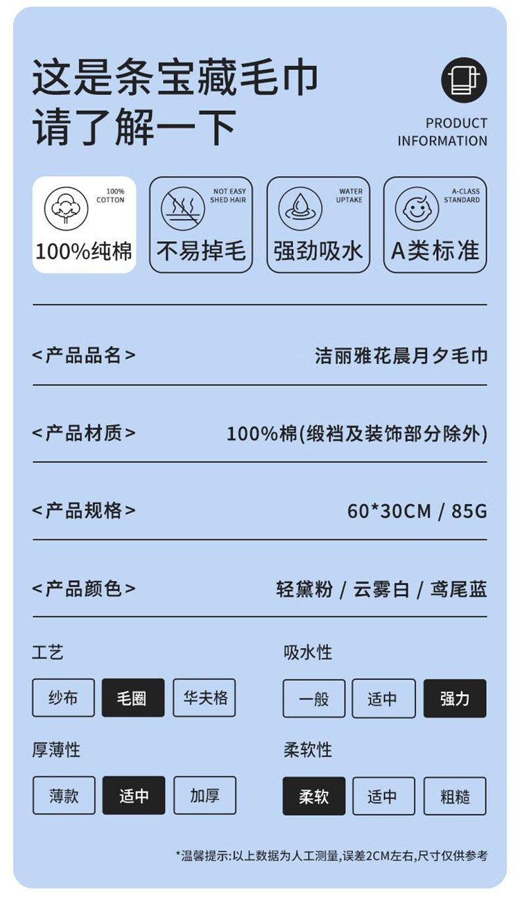 商品属性 [供应商] 得力集团有限公司 [品牌] 洁丽雅(Grace) [型号] W1786 [商品标题] 洁丽雅W1786 A类长绒棉毛巾 粉+蓝+白 3条(单位:组) [销售单位] 组