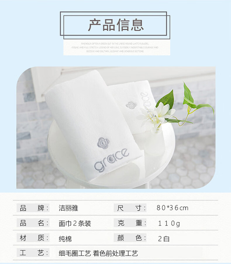 商品属性 [供应商] 德致商成集团有限公司 [安全类别] A类 [面料成分] 棉 [面料俗称] 纯棉 [包装清单] 毛巾*2 [工艺] 毛圈 [类别] 普通毛巾