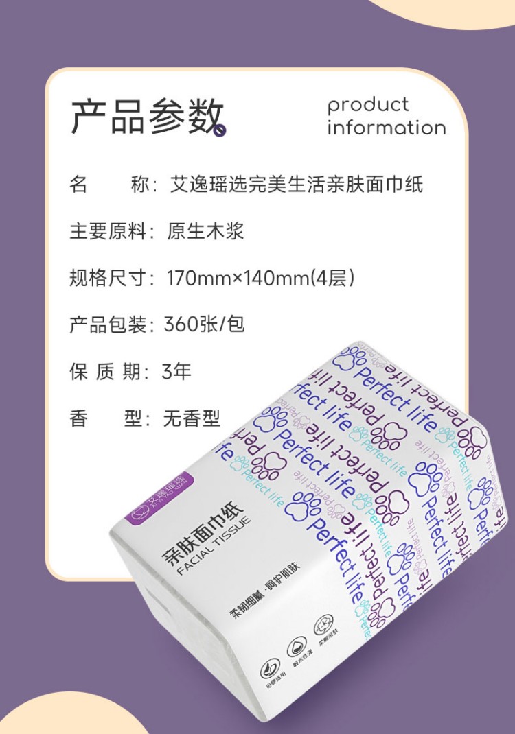 商品属性 [供应商] 得力集团有限公司 [品牌] 艾逸瑶选 [型号] AYYX038-4 [商品标题] 艾逸瑶选AYYX038-4抽纸360张4包170*140mm(单位:提) [销售单位] 提