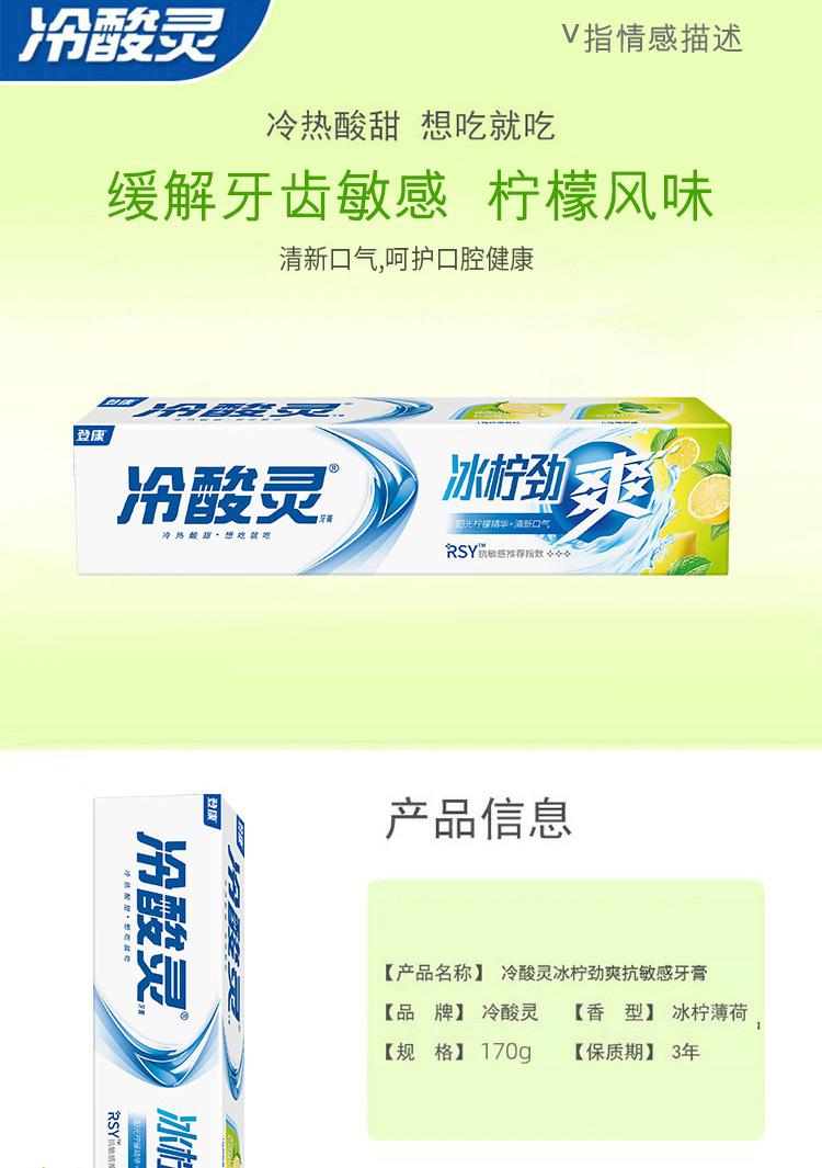商品属性 [供应商] 深圳市怡亚通供应链股份有限公司 [品牌:] 冷酸灵 [型号:] 冰柠薄荷 [规格:] 170g