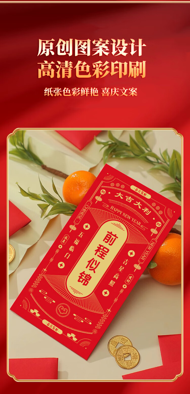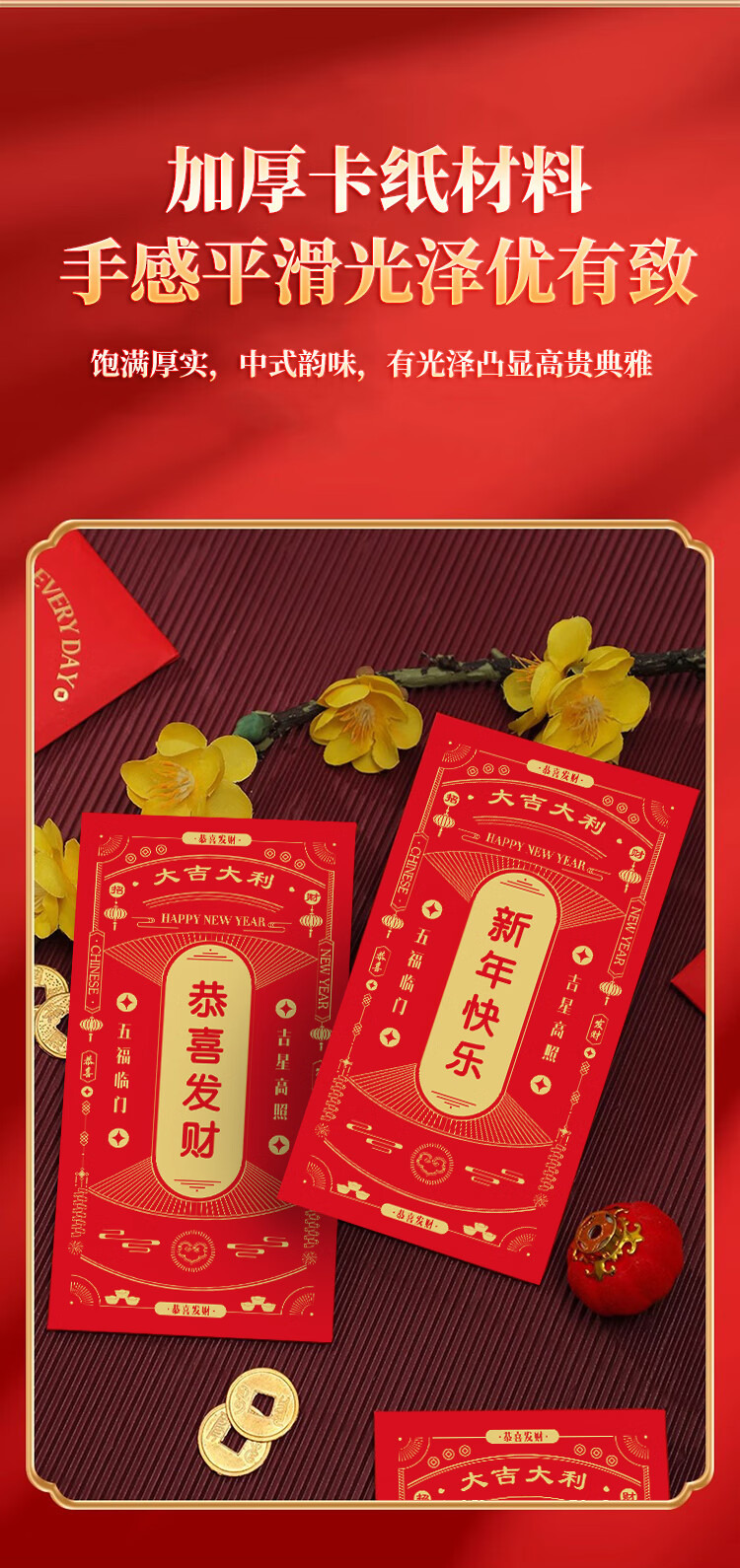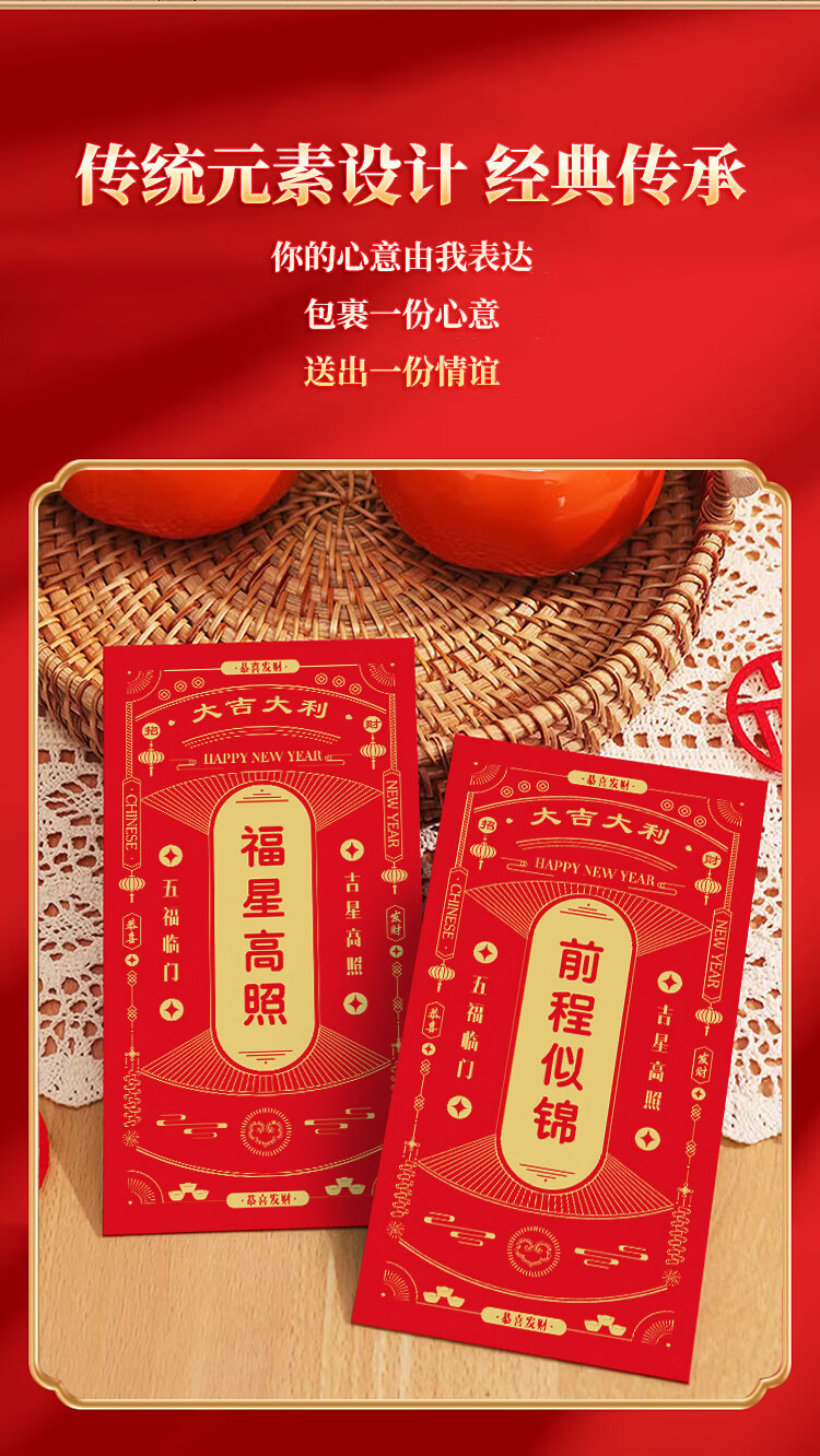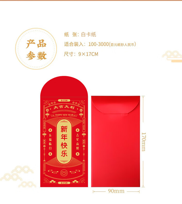 商品属性 [供应商] 深圳市怡亚通供应链股份有限公司 [品牌:] 至同全 [型号:] 新年中式红包 [规格:] 9*17cm 6个/包