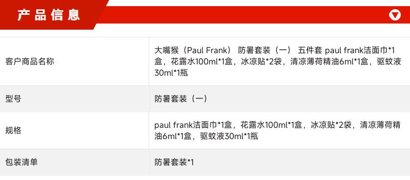 商品属性 [供应商] 史泰博(上海)有限公司 [品牌] 大嘴猴(Paul Frank) [型号] 防暑套装(一)