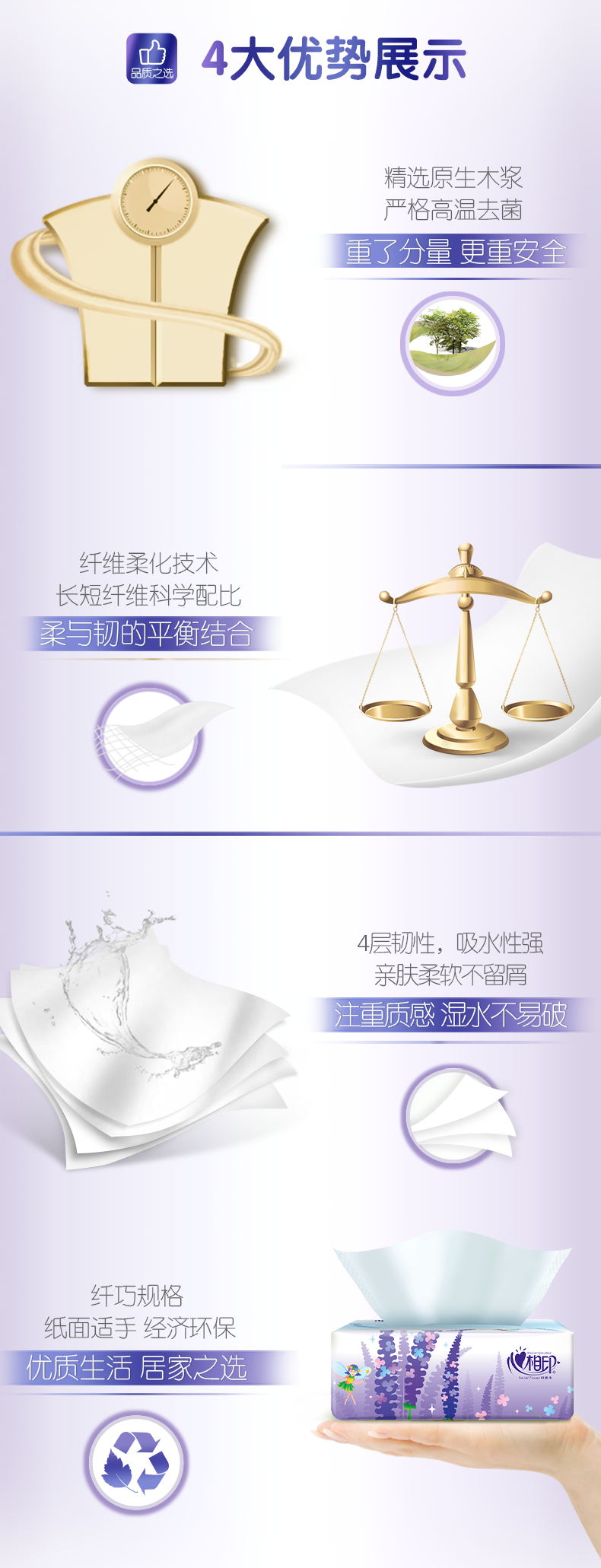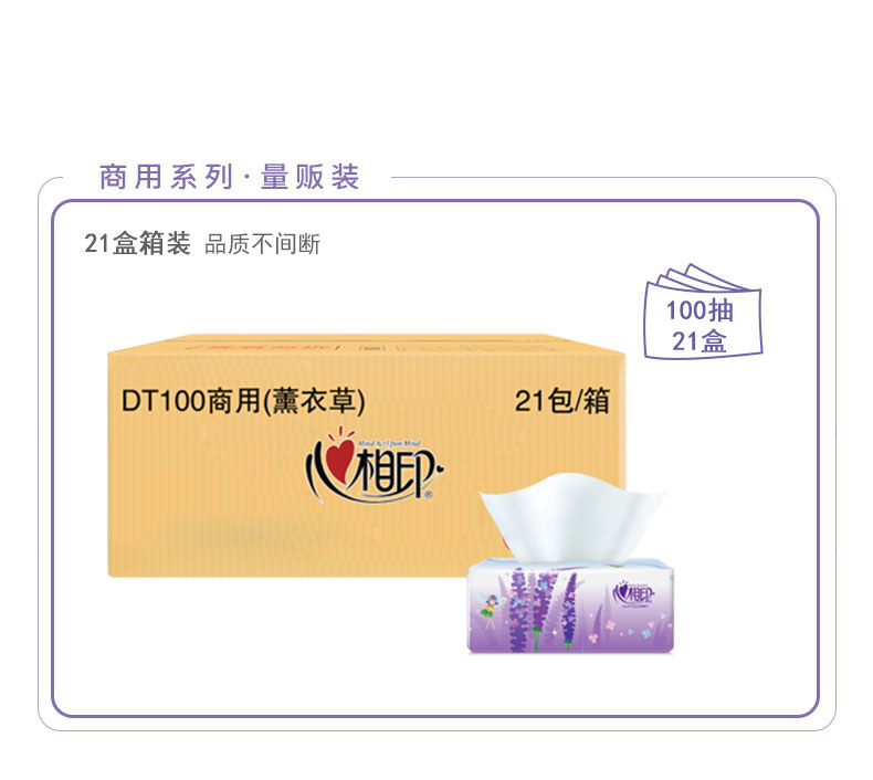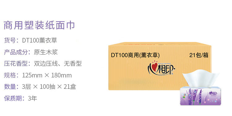 商品属性 [供应商] 深圳市云中鹤科技股份有限公司 [品牌名称:] 心相印 [商品型号:] DT100薰衣草 [商品sku编码:] 1125899908117085 [重量:] 2.44kg [产地:] 中国 [单位:] 箱 [保质期:] 1095天