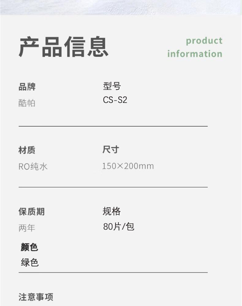 商品属性 [供应商] 科力普科技集团股份有限公司 [单张尺寸] 150*200mm [包装规格] 150x200mm 80片/包 [片数] 80 [品牌] 酷帕 [型号] CS-S2