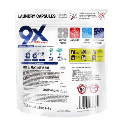 商品属性 [供应商] 上海邮乐网络技术有限公司 [<p>名称</p>] 威露士9X除菌洗衣珠 20粒(袋装) [产品规格] 12g*20粒袋装 [主要成分] 表面活性剂、软化剂、分散剂、香精、酶制剂、着色剂、水溶性膜 [功效] 有效除菌99.9%,除螨99%,9倍^洁净力,强效去污 [保 质 期] 5年