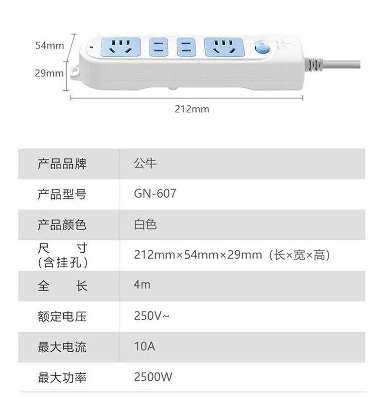 商品属性 [供应商] 科力普科技集团股份有限公司 [插孔数] 4孔 [类型] 拖线板插座 [有无独立开关] 无 [品牌] 公牛 [型号] GN-607