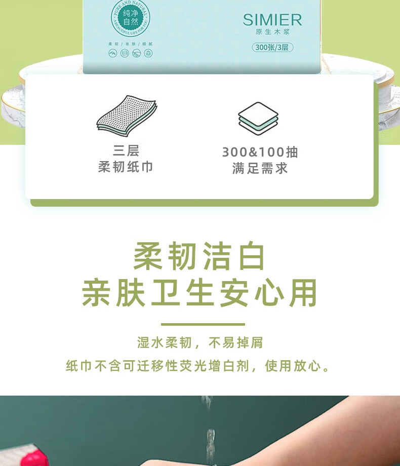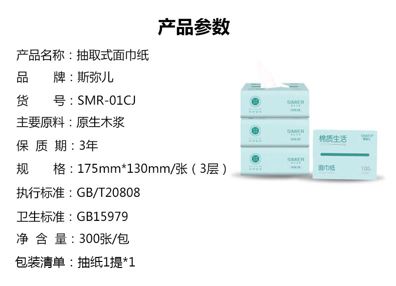 商品属性 [供应商] 得力集团有限公司 [品牌] 斯弥儿 [型号] SMR-01CJ [商品标题] 斯弥儿 SMR-01CJ 棉致生活系列抽纸 3层*100抽4*包(单位:提) [销售单位] 提