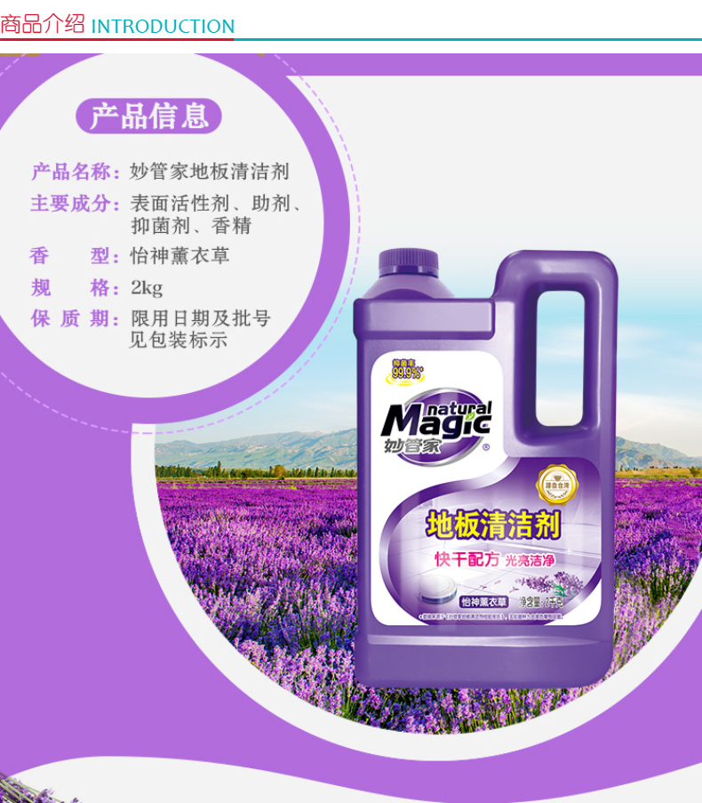 商品属性 [供应商] 科力普科技集团股份有限公司 [保质期] 1080天 [香型] 无 [产地] 中国 [功效] 地板清洁 [品牌] 妙管家 [型号] 怡神薰衣草香 [内包装] 6瓶/箱