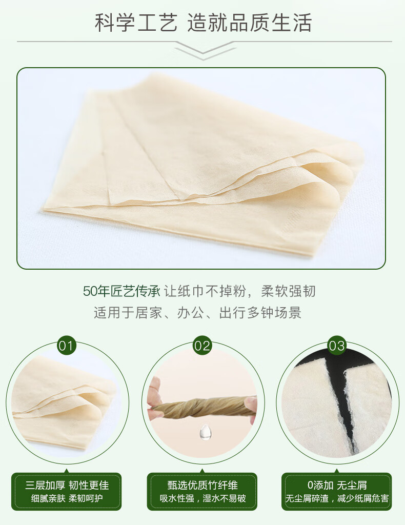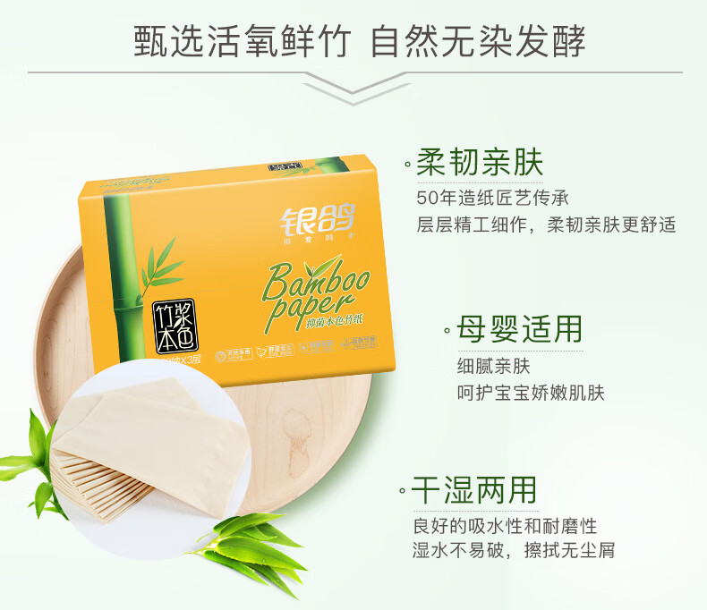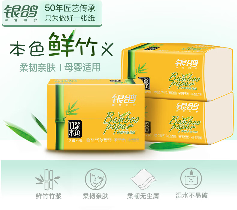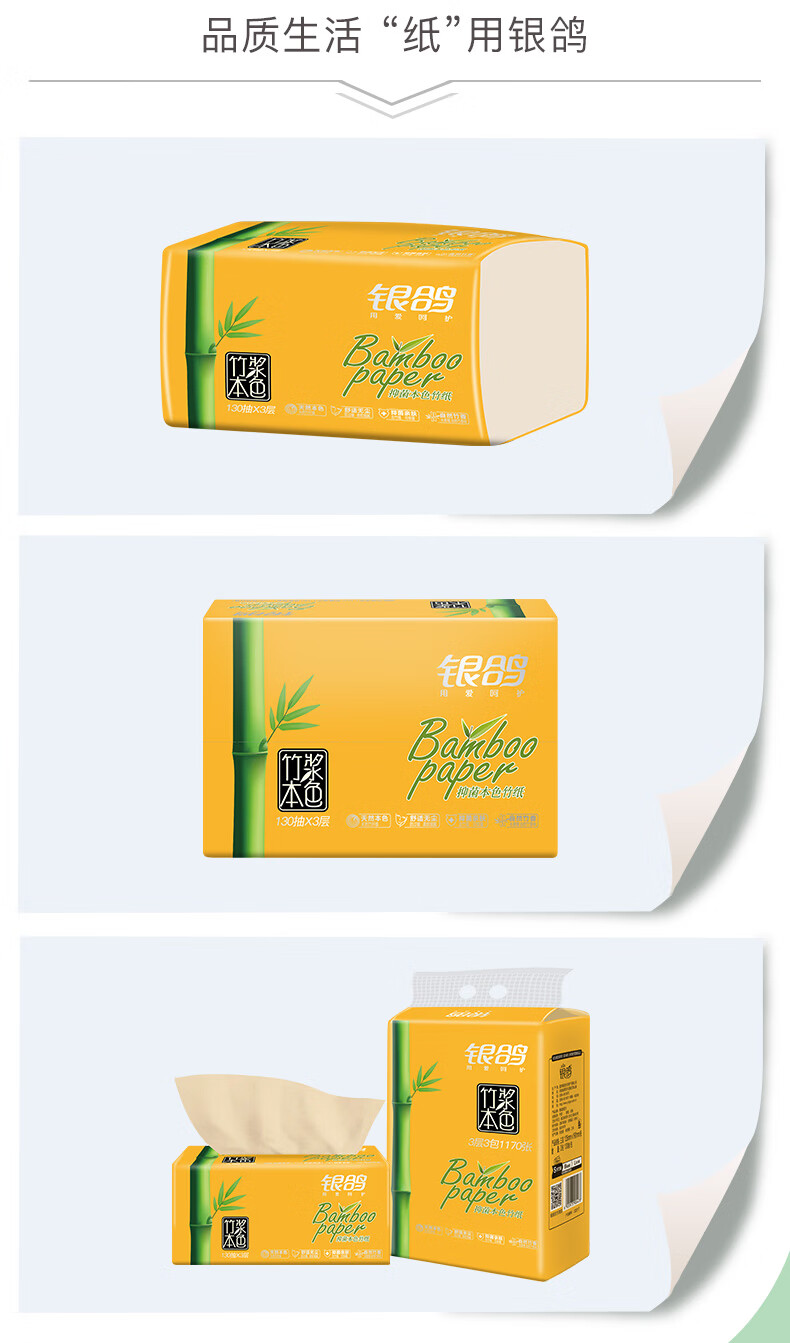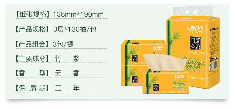 商品属性 [供应商] 得力集团有限公司 [品牌] 银鸽 [型号] 130抽3连包 [商品标题] 银鸽 竹浆本色130抽3连包软抽 三层135*190mm 130抽/包 3包/提(单位:提) [销售单位] 提
