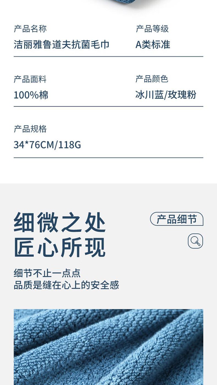 商品属性 [供应商] 得力集团有限公司 [品牌] 洁丽雅(Grace) [型号] W0159 [商品标题] 洁丽雅W0159抗菌毛巾34*76cm/115g 双条袋装(单位:组) [销售单位] 组