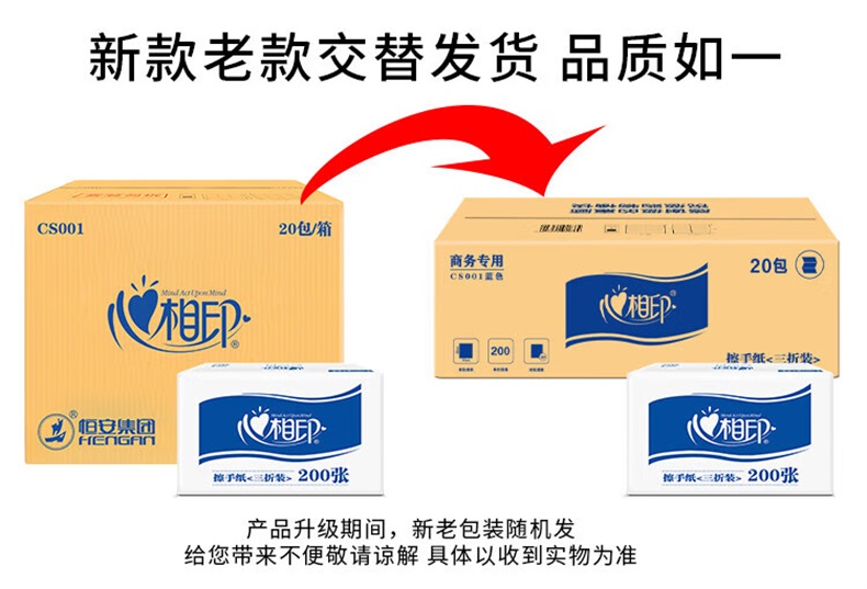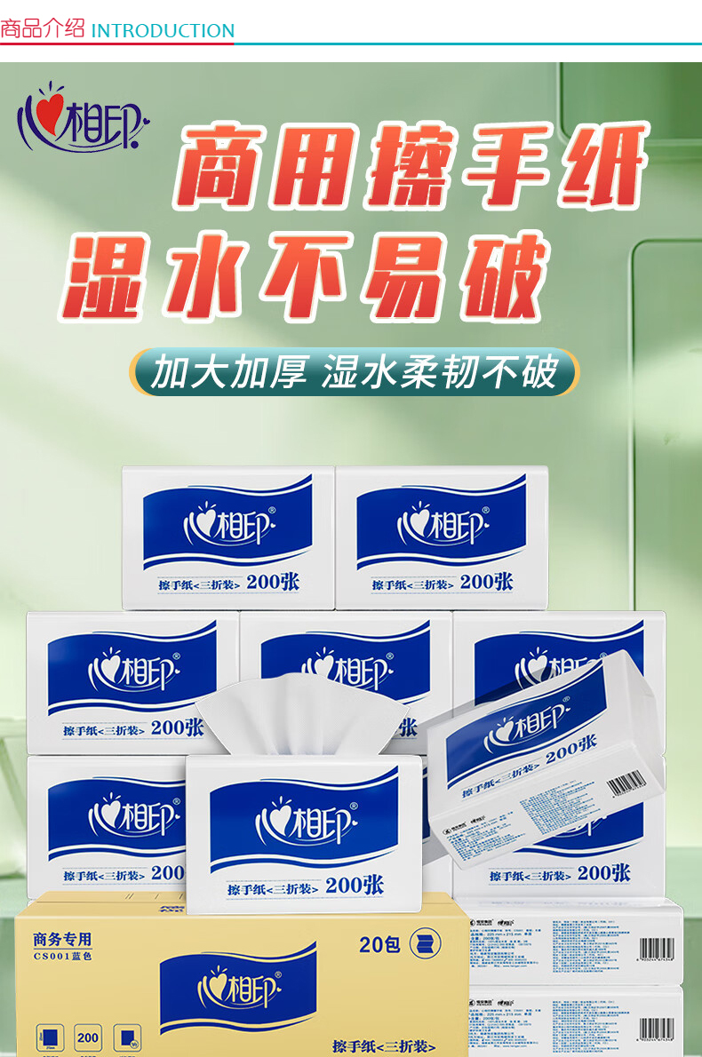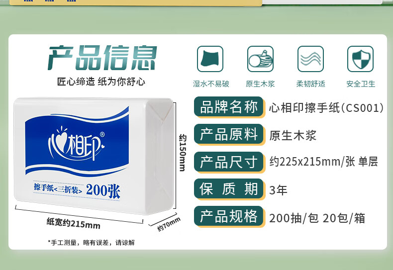 商品属性 [供应商] 科力普科技集团股份有限公司 [层数] 单层 [张数] 200张 [包装规格] 单层三折 225mm*215mm 200抽/包 [品牌] 心相印 [型号] CS001 [内包装] 20包/箱
