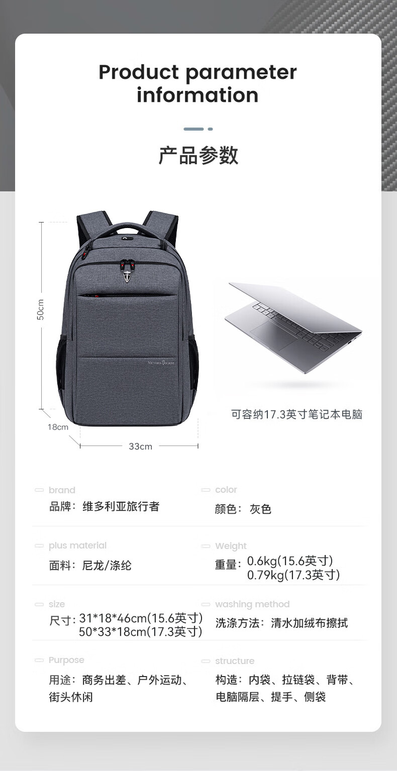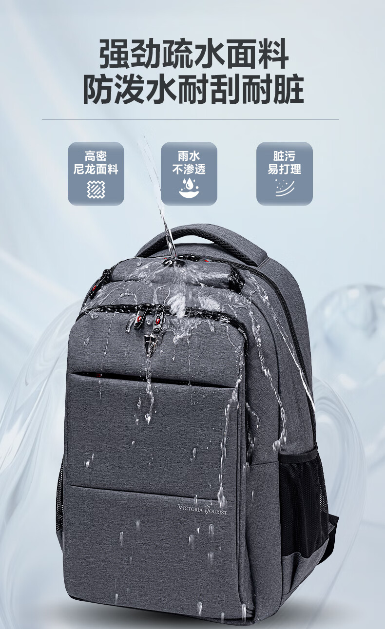 商品属性 [供应商] 德致商成集团有限公司 [适用性别] 男士 [图案] 纯色 [通勤风] 商务风 [材质] 涤纶(聚酯纤维) [防水强度] 防泼水 [风格] 通勤风 [包装清单] 背包*1 [闭合方式] 拉链 [类别] 双肩电脑包