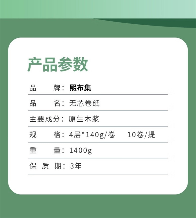 商品属性 [供应商] 科力普科技集团股份有限公司 [层数] 4 [商品类型] 卷纸 [克重] 140 [包装规格] 4层*140g/卷 10卷/提 [品牌] 熙布集 [型号] DZ0024