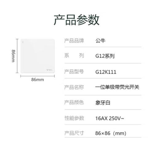 商品属性 [供应商] 大江科技集团有限公司 [产品颜色] 象牙白 [品牌] 公牛(BULL) [类别] 开关 [尺寸] 86*86mm