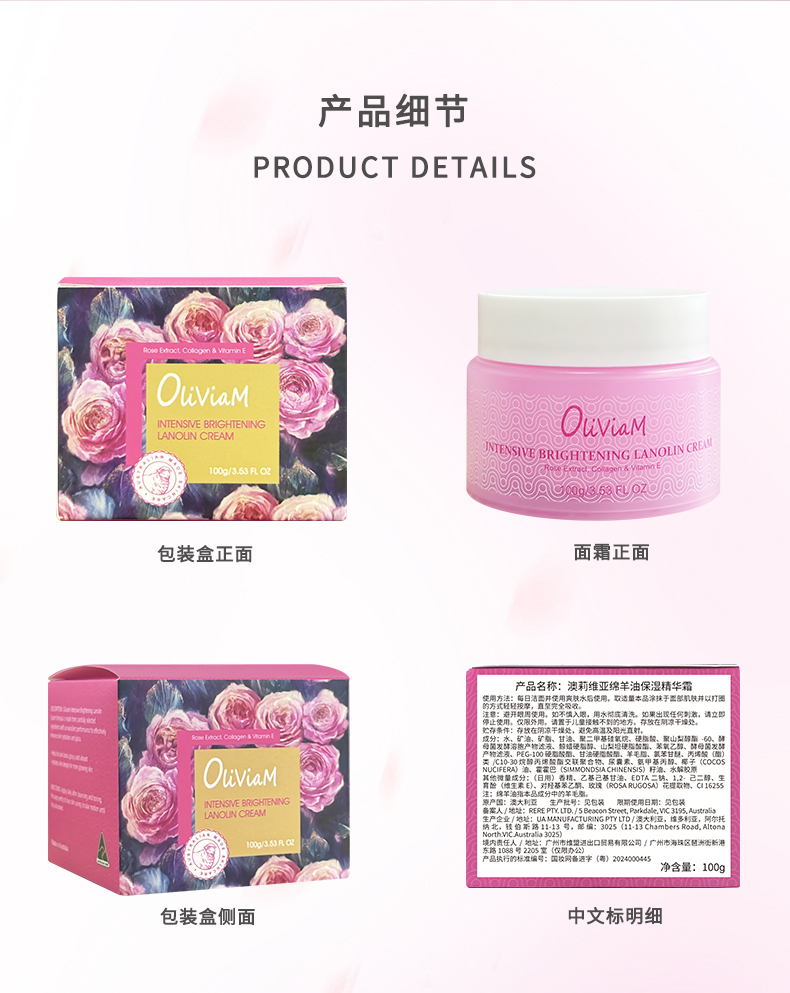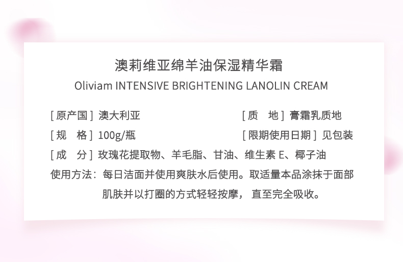 商品属性 [供应商] 科力普科技集团股份有限公司 [商品产地] 澳大利亚 [批准文号/备案编号] 国妆网备进字(粤)2024000445 [容量] 100g [保质期] 5年 [净含量] 100g [是否特殊化妆品] 否 [品牌] 澳莉维亚 [型号] 绵羊油