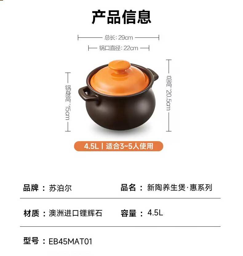商品属性 [供应商] 深圳市怡亚通供应链股份有限公司 [品牌:] 苏泊尔(SUPOR) [型号:] EB45MAT01 [规格:] 4.5L 陶瓷