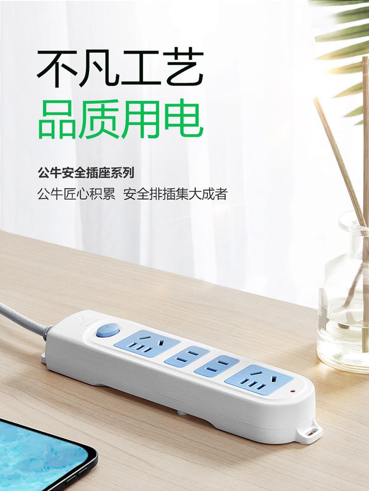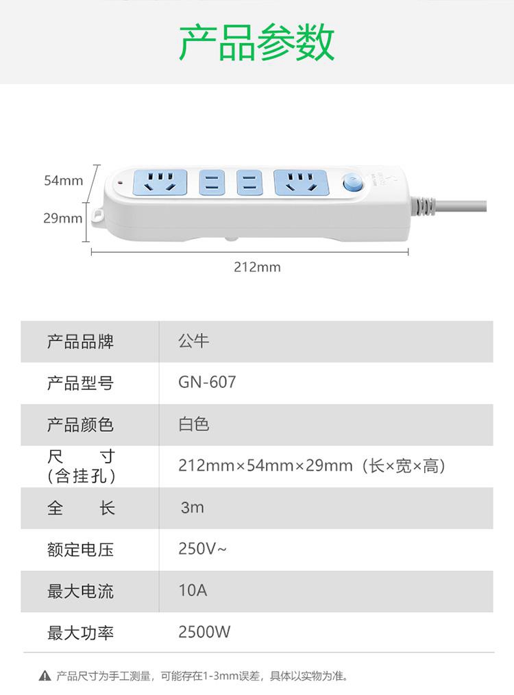 商品属性 [供应商] 得力集团有限公司 [<li>品牌</li>] 公牛(BULL) [型号] GN-607 [商品标题] 公牛GN-607总控4位插排3米(个) [销售单位] 个 [名称] 电源插座规格:250V 10A 单相6位插排