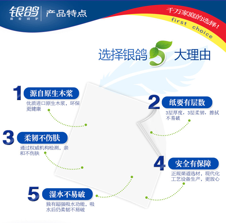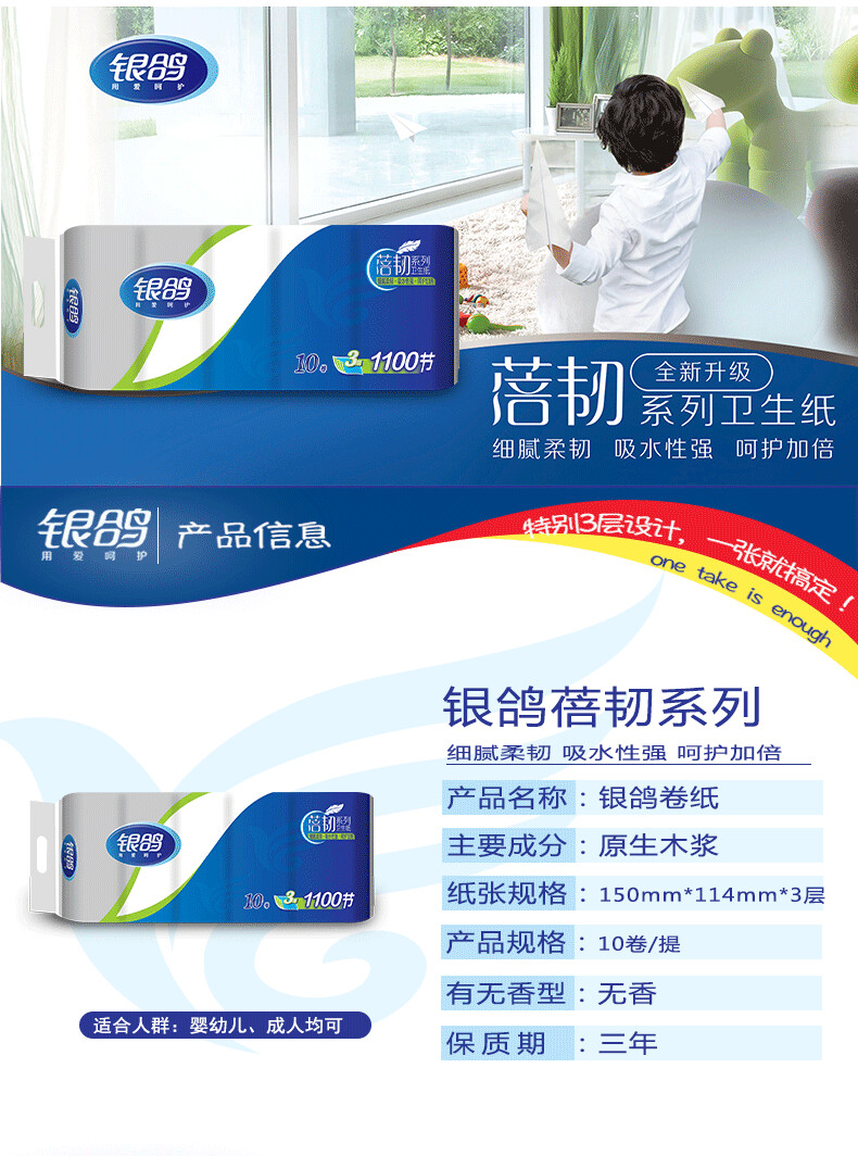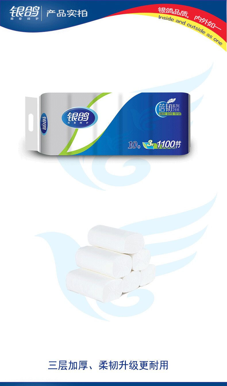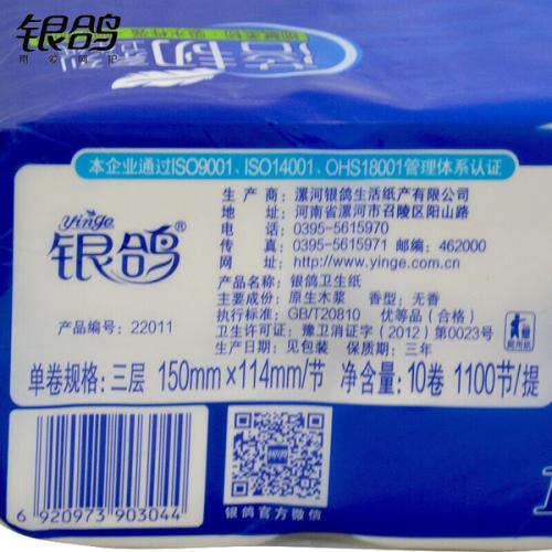 商品属性 [供应商] 得力集团有限公司 [品牌] 银鸽 [型号] 1100节卷纸 [商品标题] 银鸽 1100节卷纸 三层 150*114mm 10卷/提(单位:提) [销售单位] 提