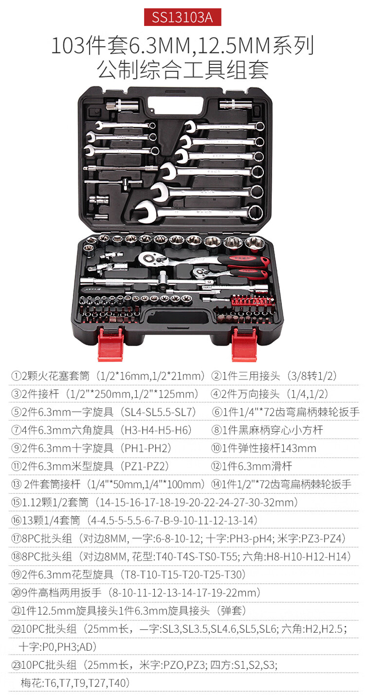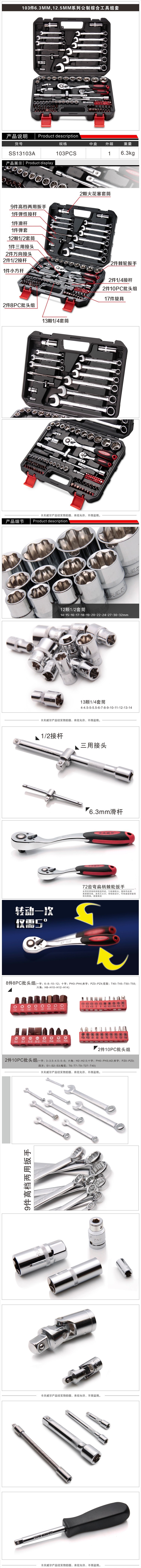 商品属性 [供应商] 德致商成集团有限公司 [商品毛重] 6.3kg [包装清单] 103件6.3+12.5mm机修/汽修套筒工具箱套装工具组套x1 [类别] 汽修组套