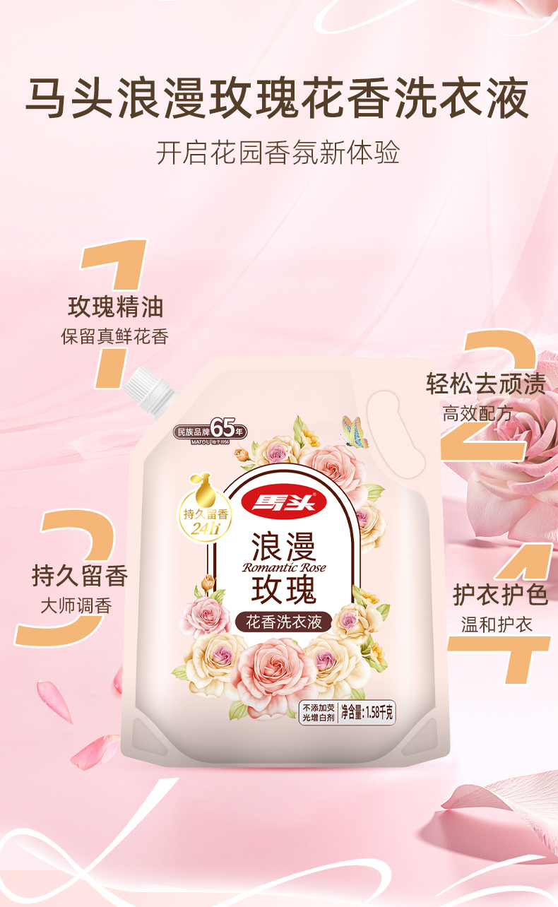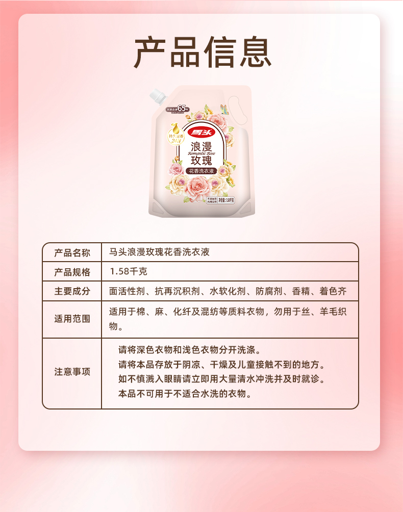 商品属性 [供应商] 科力普科技集团股份有限公司 [香型] 玫瑰花香 [功效] 去渍 [产地] 湖南 [保质期] 3年 [品牌] 马头 [型号] JC007