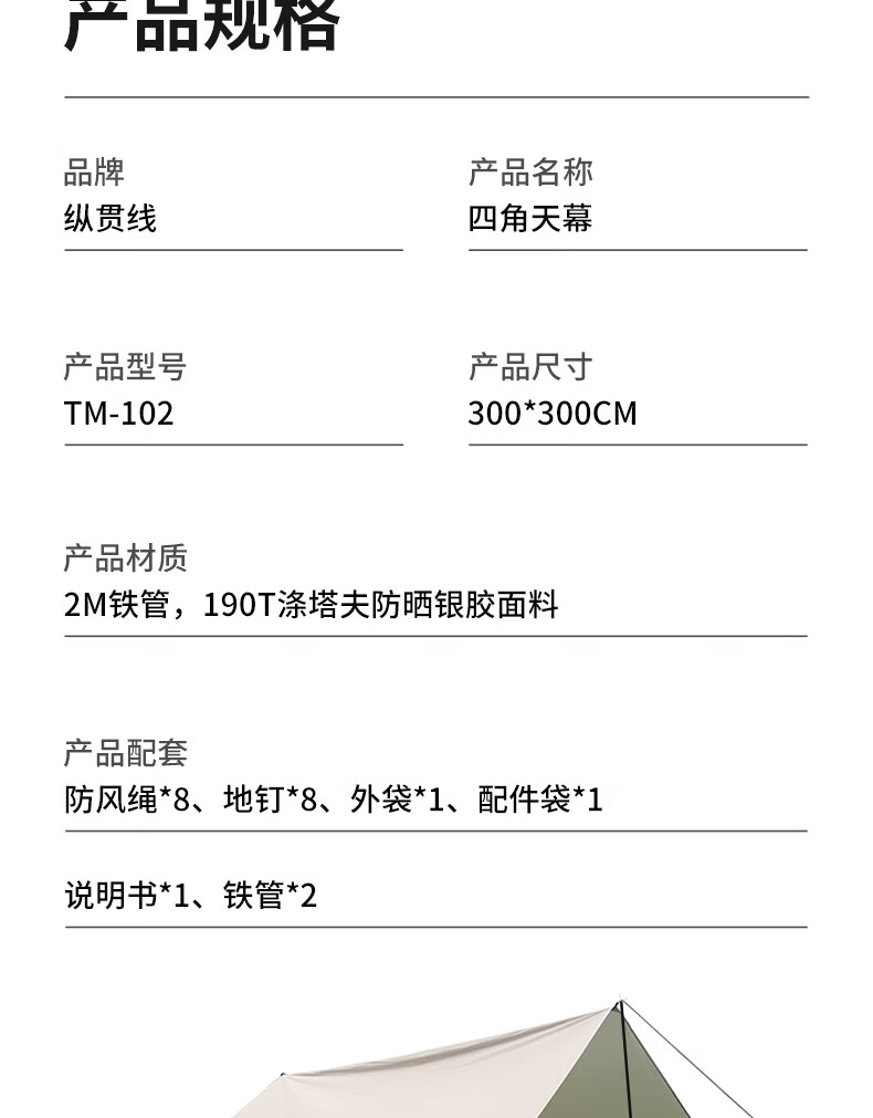 商品属性 [供应商] 得力集团有限公司 [品牌] 纵贯线 [型号] TM-102 [商品标题] 纵贯线(Seashore)四角天幕TM-102 300*300cm(单位:顶) [销售单位] 顶