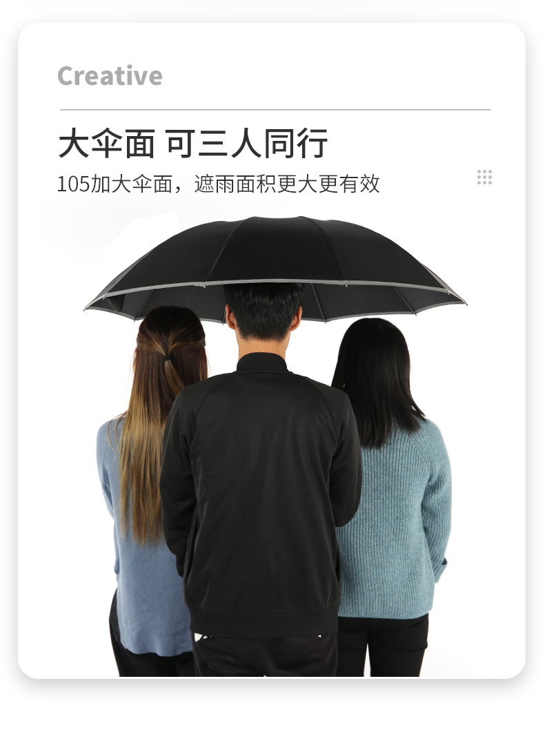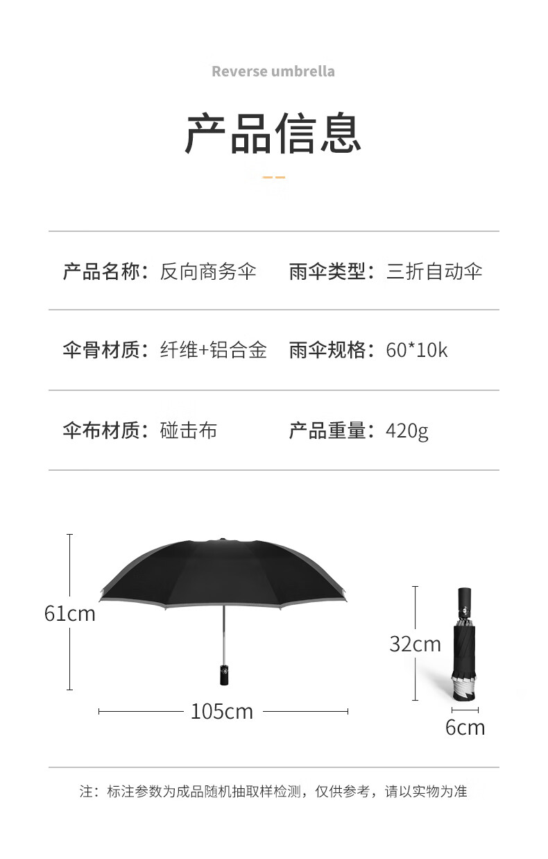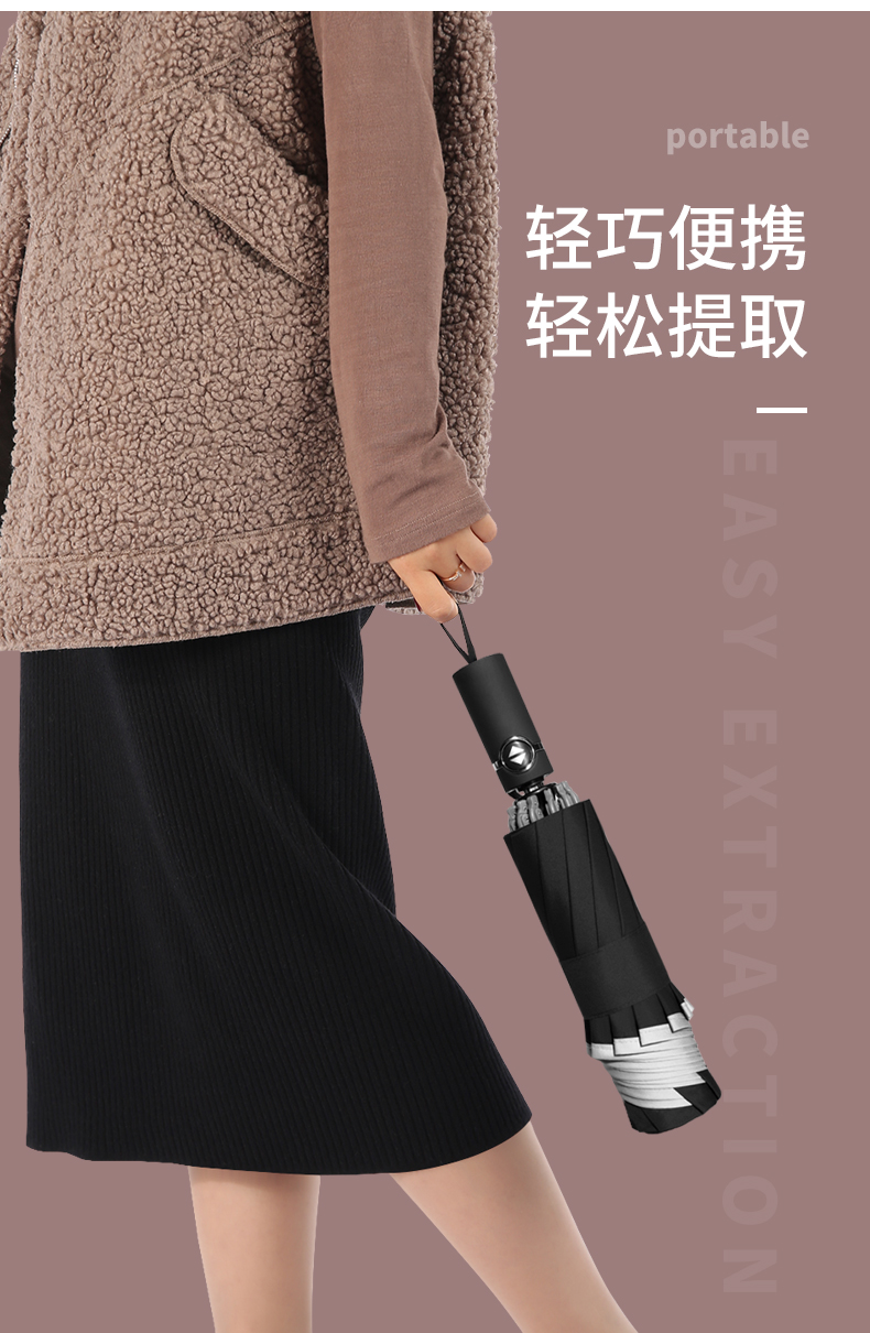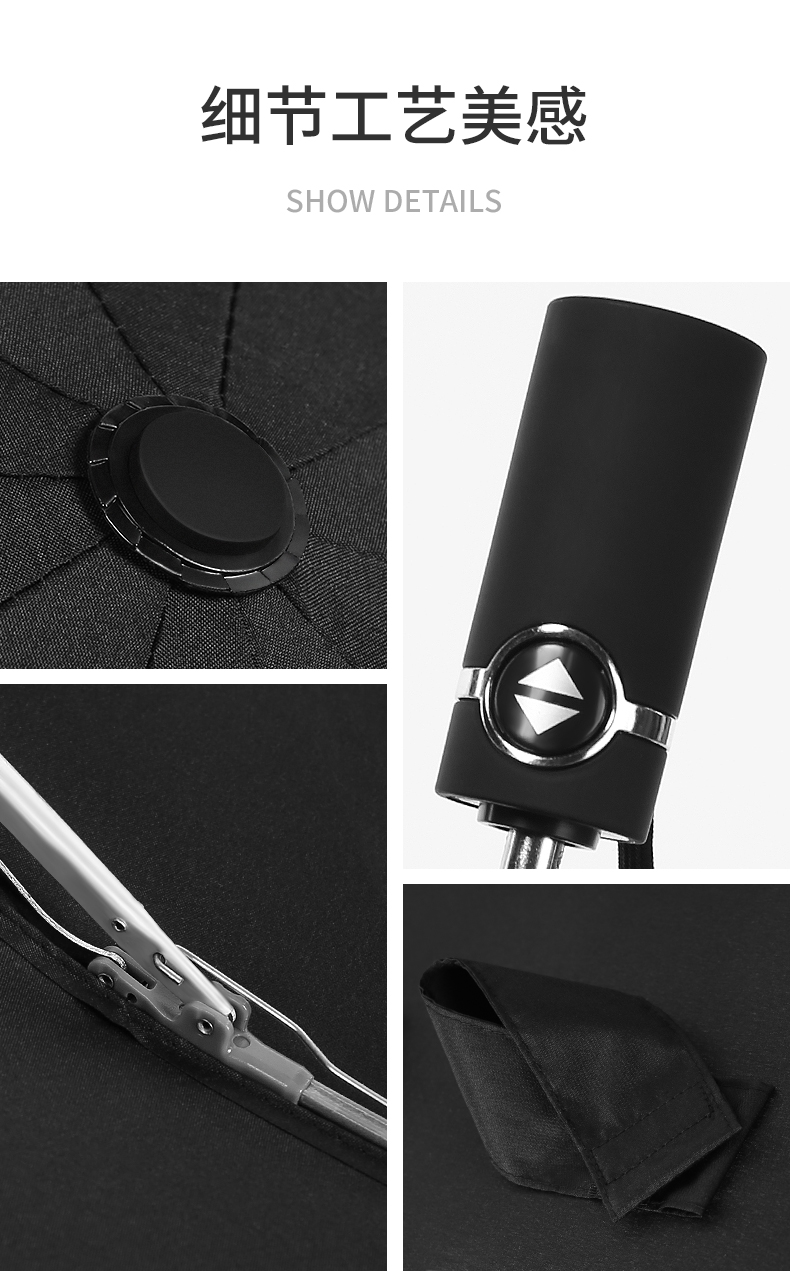 商品属性 [供应商] 德致商成集团有限公司 [雨伞折数] 三折 [打开方式] 全自动 [图案] 纯色 [伞布面料] 碰击布 [适用人群] 成人 [伞骨材质] 玻璃纤维 [骨数] 10骨 [包装清单] 伞x1 [类别] 雨伞