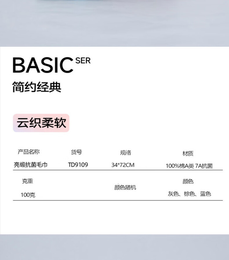 商品属性 [供应商] 得力集团有限公司 [品牌] 三利 [型号] TD9109 [商品标题] 三利 亮缎抗菌毛巾 TD9109(单位:条) [销售单位] 条