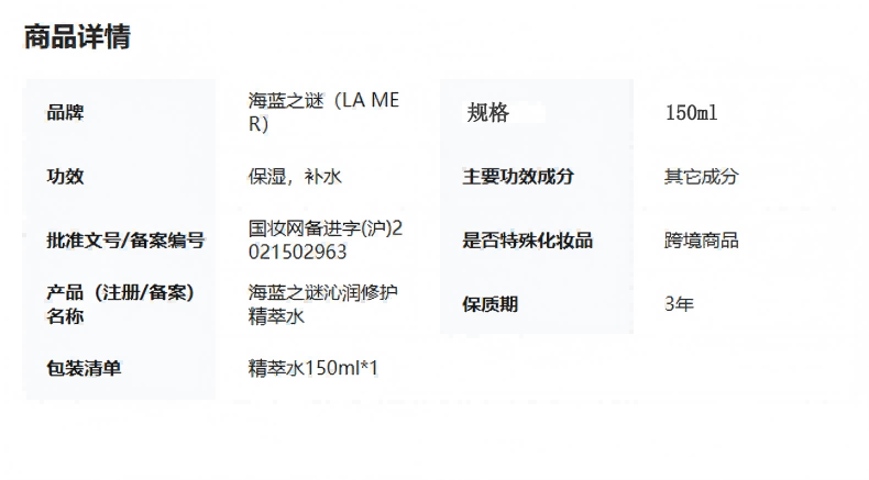 商品属性 [供应商] 深圳市怡亚通供应链股份有限公司 [品牌:] 海蓝之谜(LA MER) [型号:] 修护精萃水 [规格:] 150ml