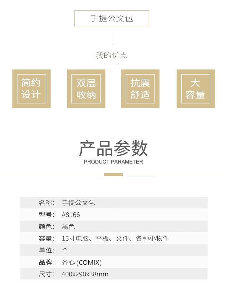 商品属性 [供应商] 深圳齐心集团股份有限公司 [品牌] 齐心(COMIX) [型号] A8166 [尺寸] 400x290x38mm [类型] 风琴包/事务包