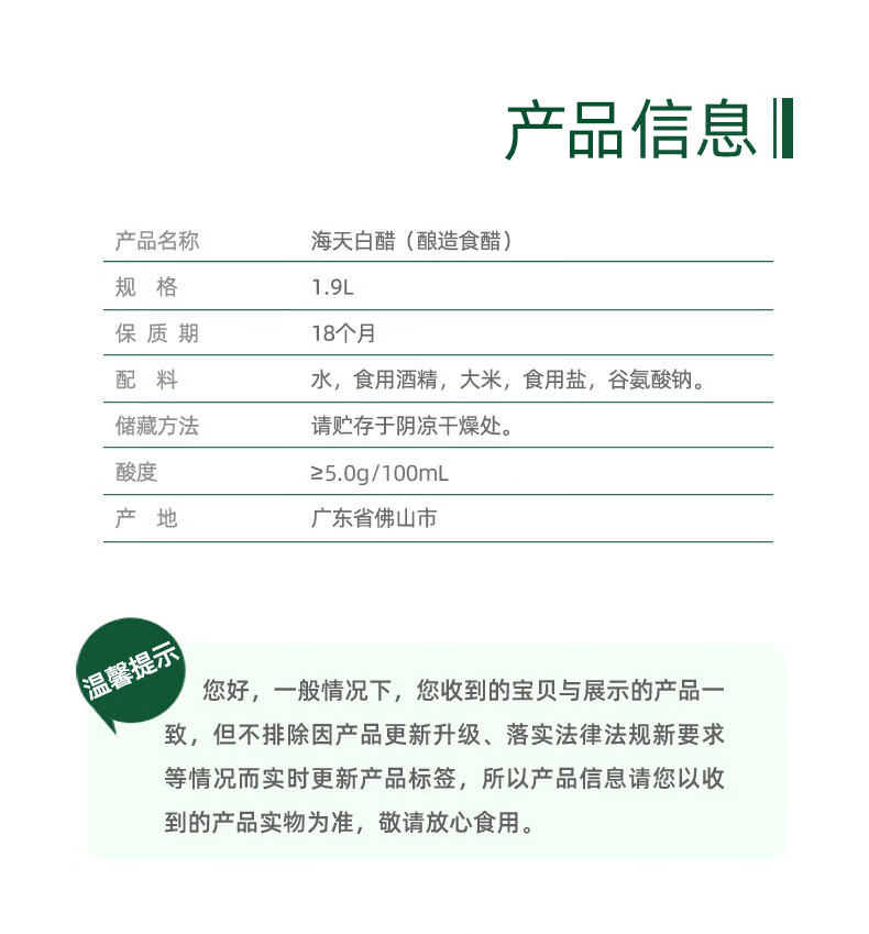 商品属性 [供应商] 德致商成集团有限公司 [商品毛重] 2.02kg [烹饪建议] 凉拌,煎炸,蒸煮 [特产品类] 镇江醋 [生产许可证号] sc10344060800014 [包装形式] 瓶装 [保质期] 18个月 [净含量] 1.9kg [产品标准号] GB18187 [商品产地] 中国大陆