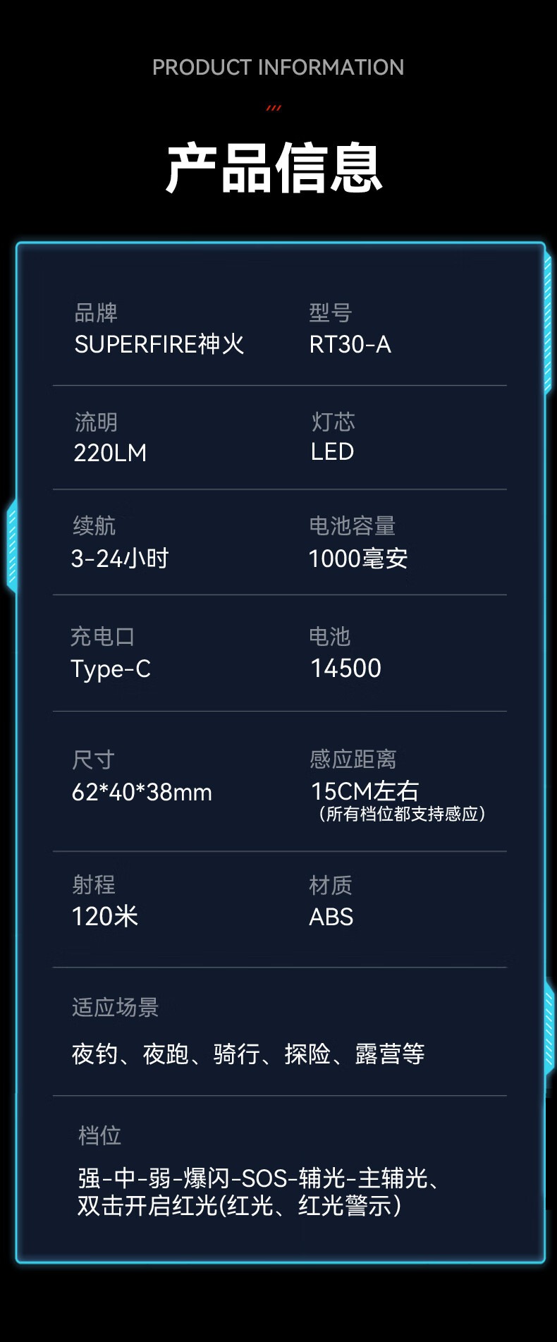 商品属性 [供应商] 深圳市怡亚通供应链股份有限公司 [品牌:] 神火(supfire) [型号:] RT30-A [规格:] 62*40*38mm