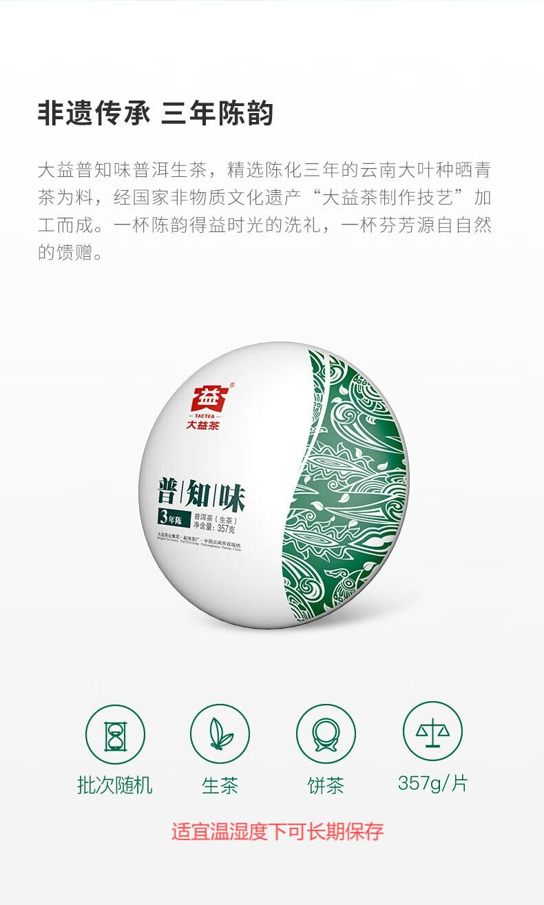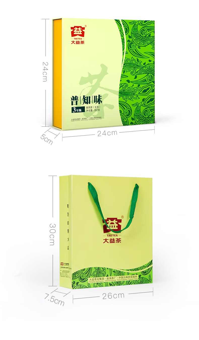 商品属性 [供应商] 深圳市怡亚通供应链股份有限公司 [品牌:] 大益(TAETEA) [型号:] 普知味3年陈普洱茶生茶礼盒 [规格:] 357g