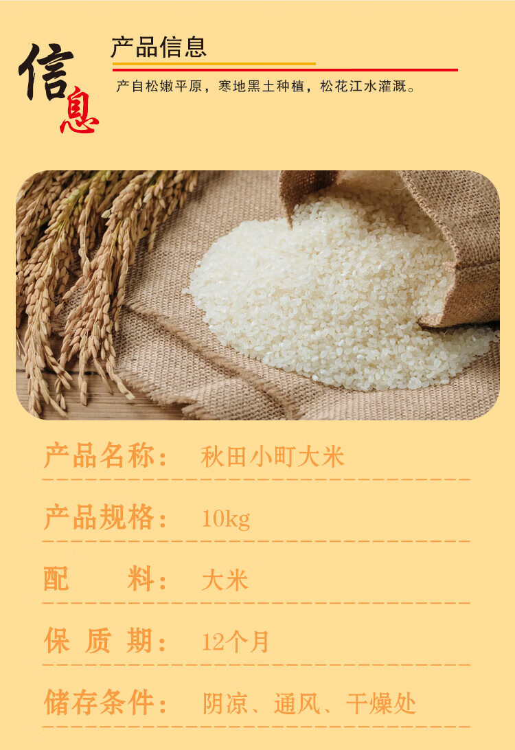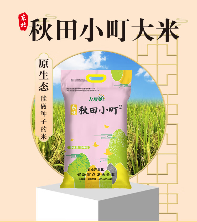 商品属性 [供应商] 得力集团有限公司 [品牌] 九月葵 [型号] 10kg [商品标题] 九月葵秋田小町大米10kg真空包装(单位:袋) [销售单位] 袋 [条形码] 6971276600413