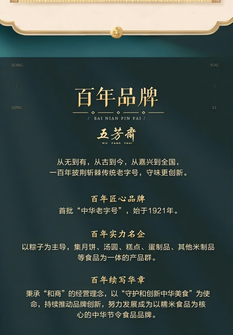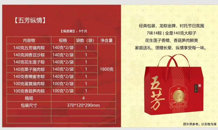 商品属性 [供应商] 深圳市怡亚通供应链股份有限公司 [品牌:] 五芳斋(WUFANGZHAI) [型号:] 五芳纵情粽子礼盒 [规格:] 1800g 14粽7味