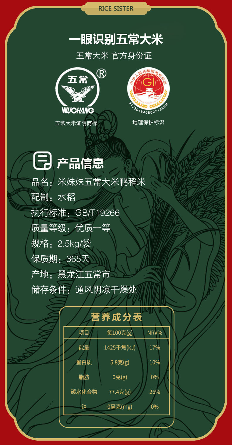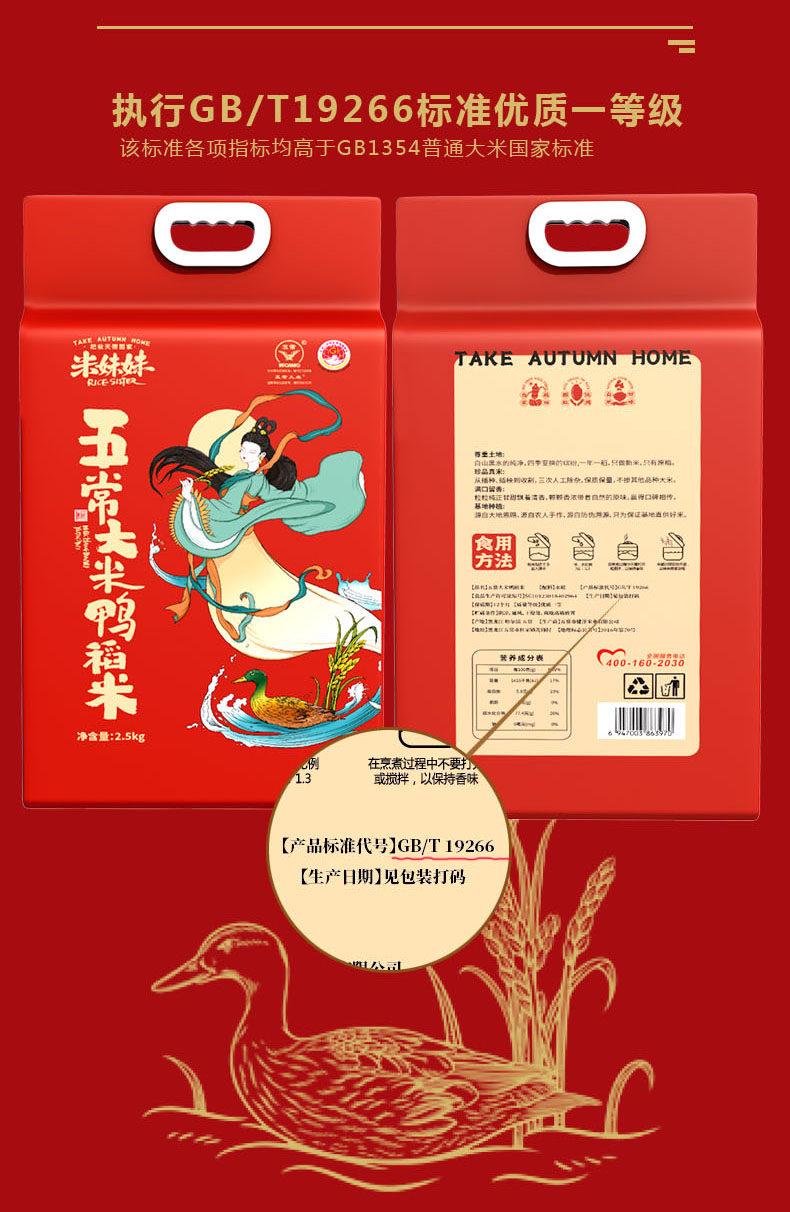 商品属性 [供应商] 深圳市怡亚通供应链股份有限公司 [品牌:] 米妹妹(MIMEIMEI) [型号:] 五常大米鸭稻米 [规格:] 2.5kg