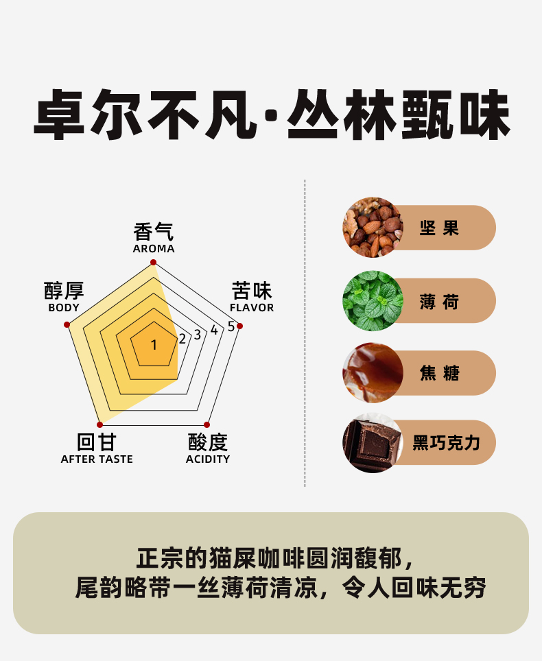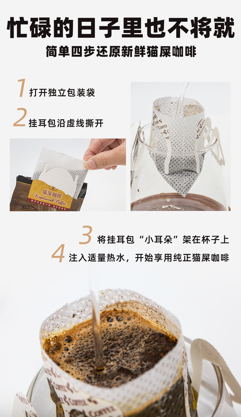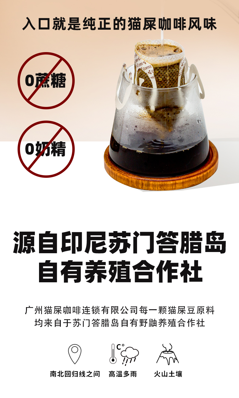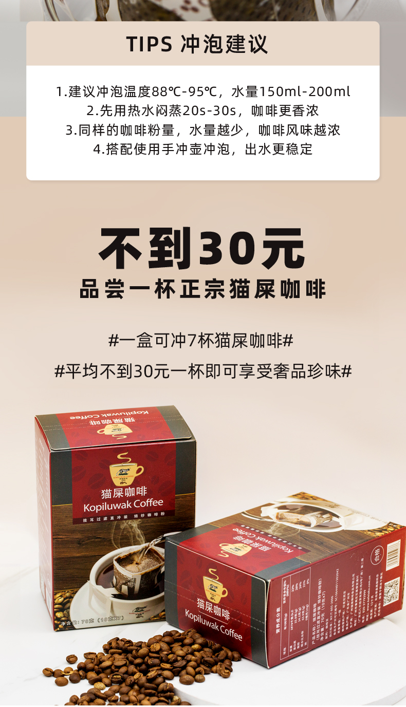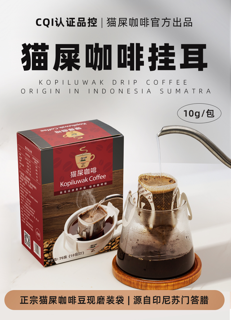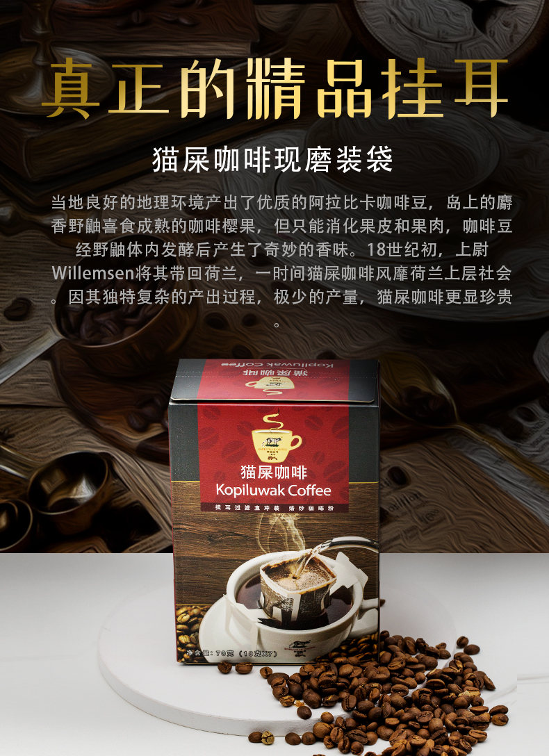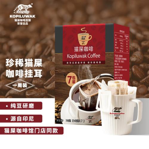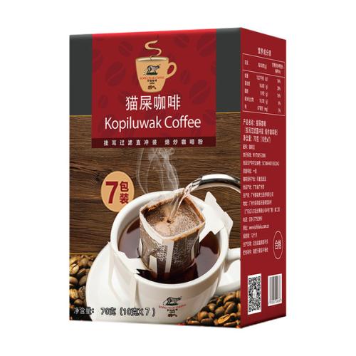 商品属性 [供应商] 深圳市怡亚通供应链股份有限公司 [品牌:] 野鼬咖啡(KOPILUWAK COFFEE) [型号:] 挂耳黑猫屎咖啡 [规格:] 10g/包 7包/盒