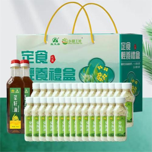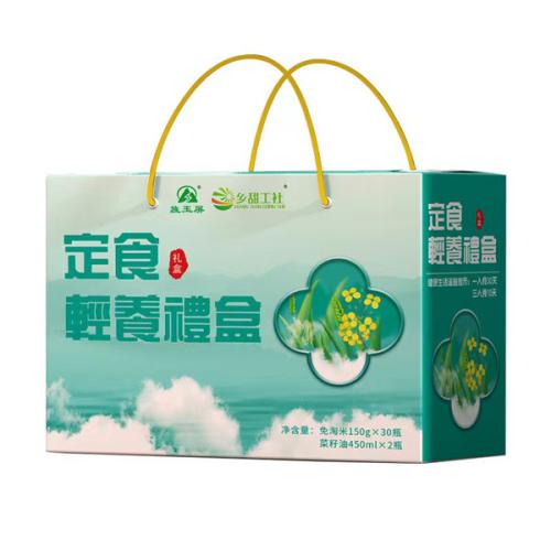 商品属性 [供应商] 上海邮乐网络技术有限公司 [属性名称] 属性值 [品牌] 旌玉屏 [名称] 定食轻养礼盒 [特性] 免淘米+菜籽油 [配料] 大米、国产菜籽 [包装形式] 盒装 [重量] 5.22kg [保质期] 12个月 [储藏方式] 请置于阴凉、通风、干燥处